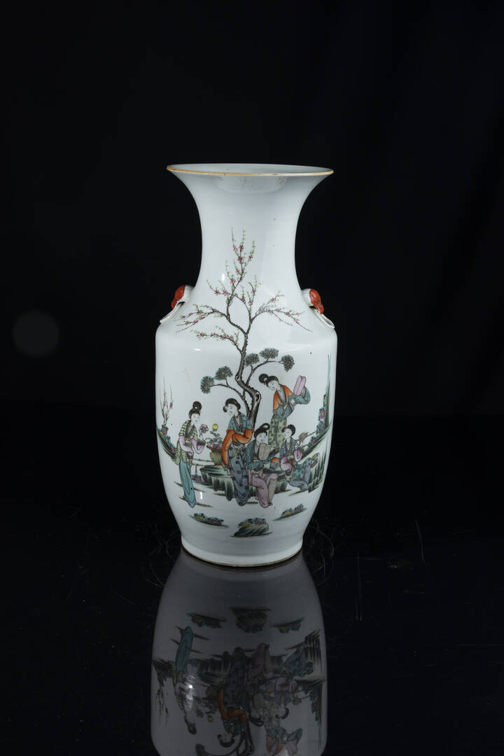 Vaso in porcellana dipinto con scene di vita quotidiana Cina, dinastia Qing, XX secolo.