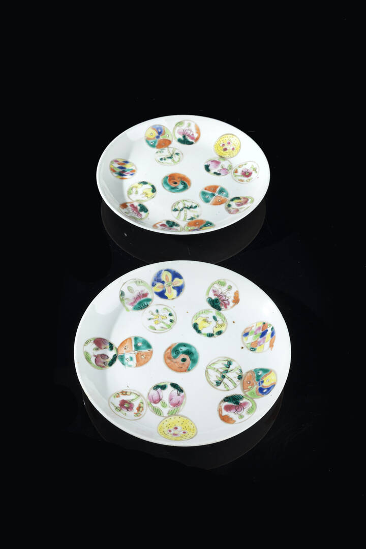 Coppia di piattini in porcellana con decoro a palloni, Cina, dinastina Qing, XIX secolo.