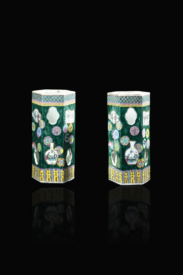 Coppia di porta cappelli in porcellana policroma su fondo verde, Cina, XX secolo.