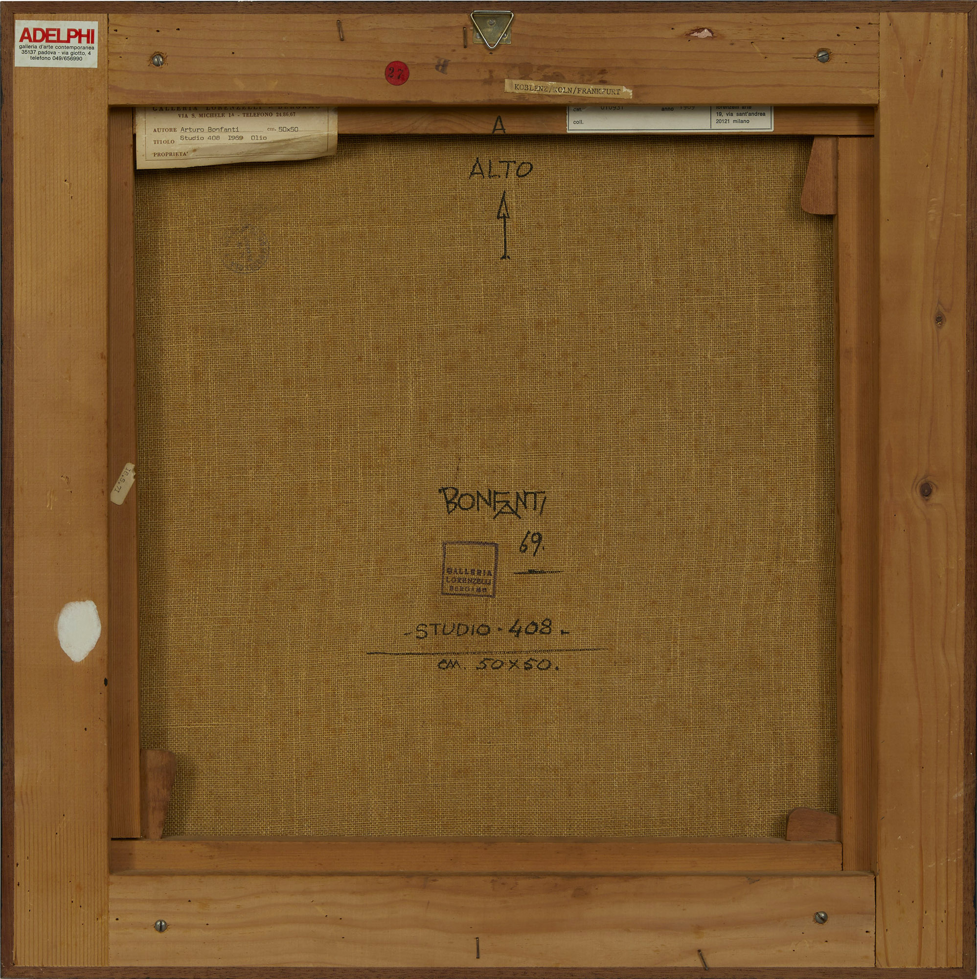 Timbro ed etichette della Galleria Lorenzelli, Bergamo; etichetta di Lorenzelli Arte, Milano; etichetta di Adelphi galleria d'arte contemporanea, Padova sul retro
