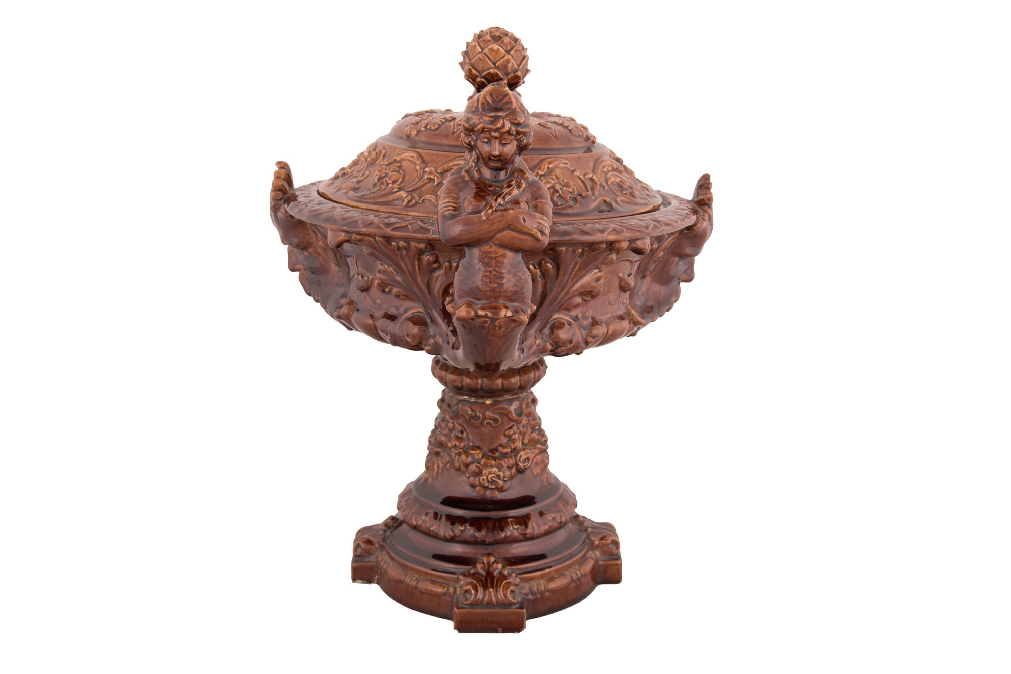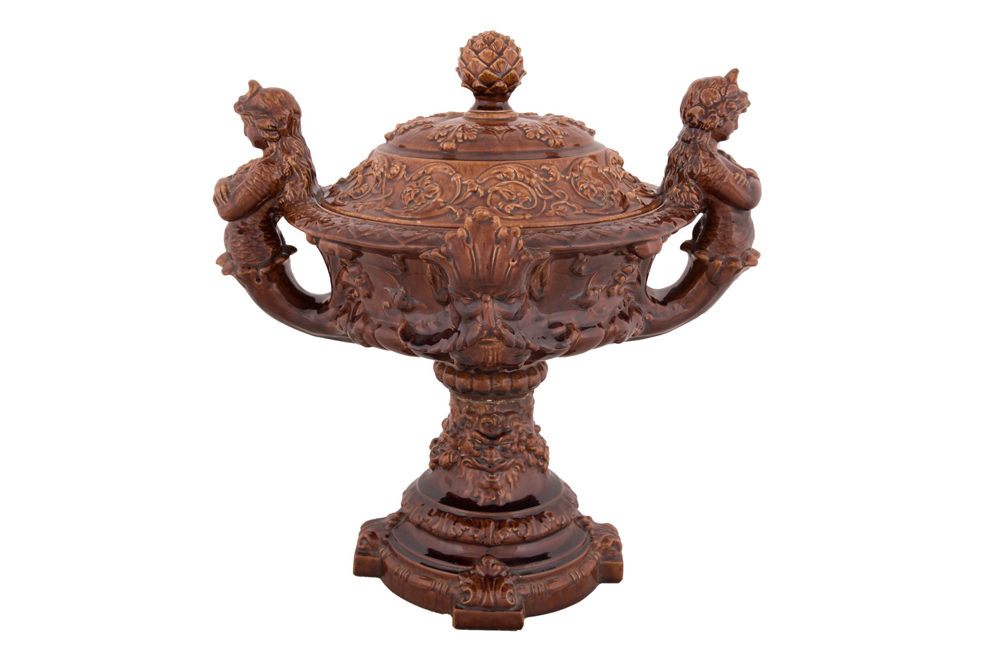 Vaso con coperchio in maiolica a lustro marrone con anse raffiguranti sirene XX secolo
