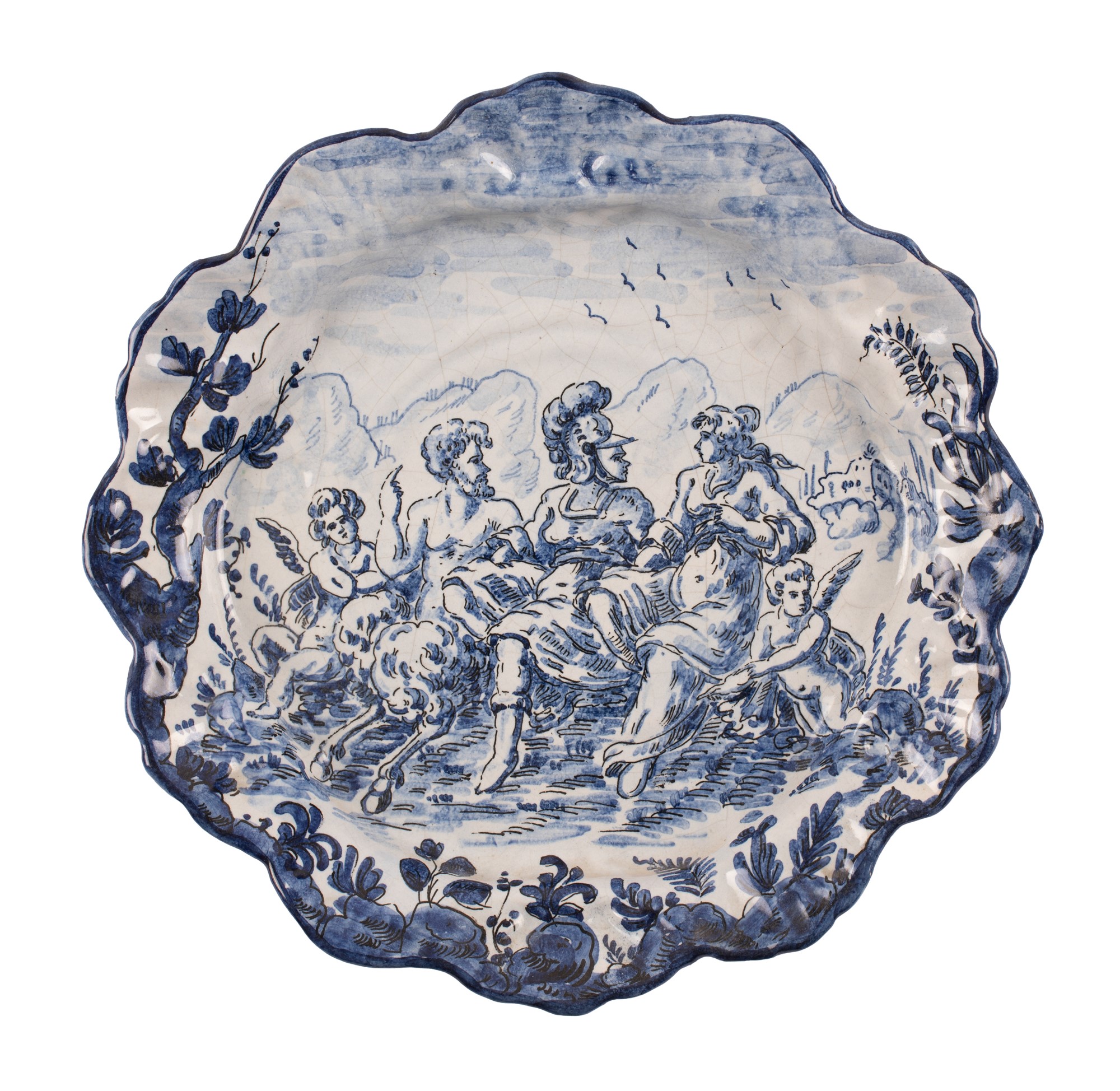 Porcellana dipinta Ø cm 33,5 Porcellana dipinta Ø cm 33,5 inizi XIX secolo Grande piatto Savona in porcellana sagomata dipinta bianca e blu, raffigurante un fauno, un uomo con elmo piumato e una donna; due angeli ai lati
