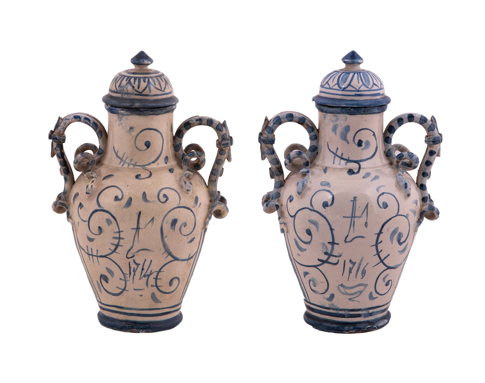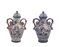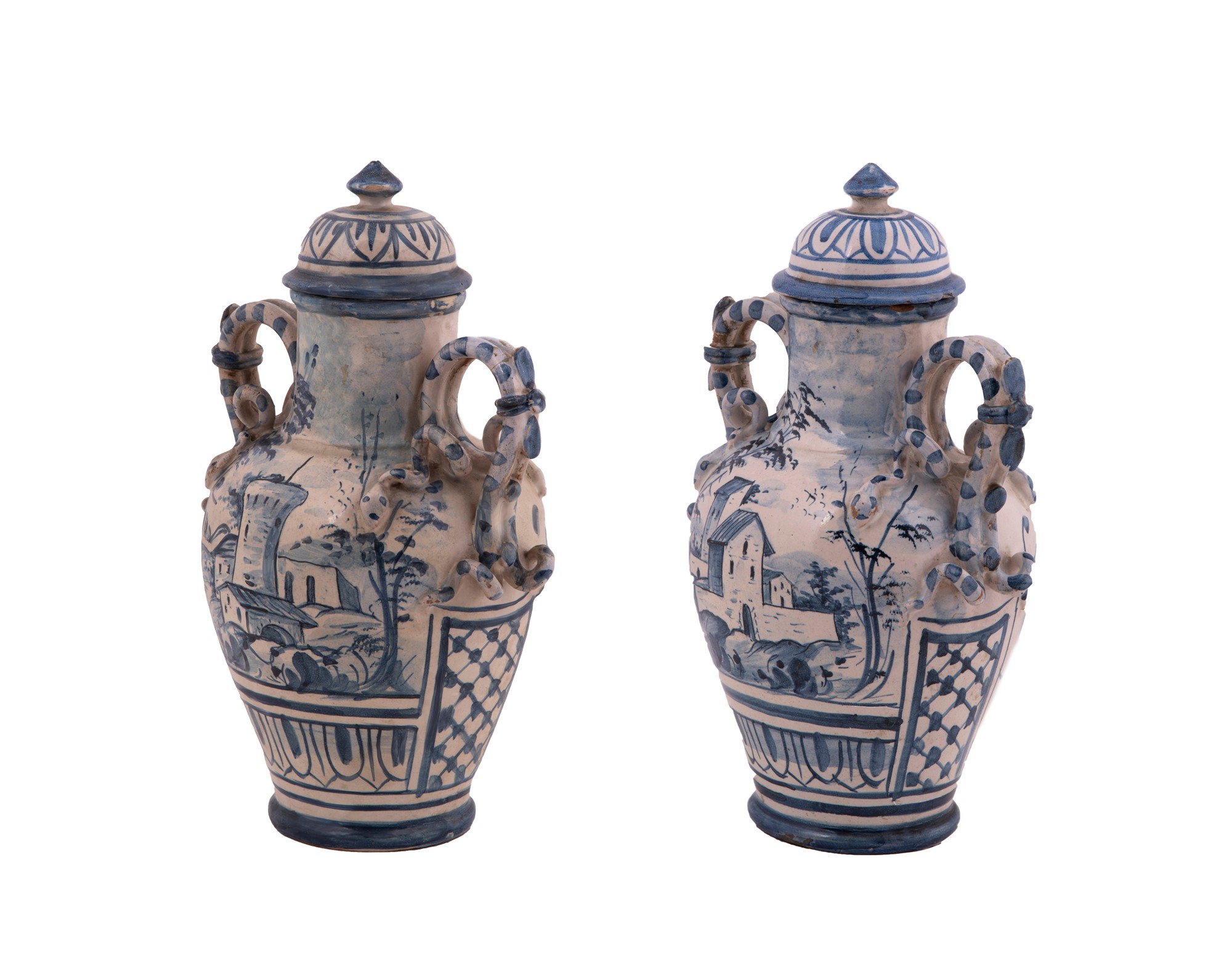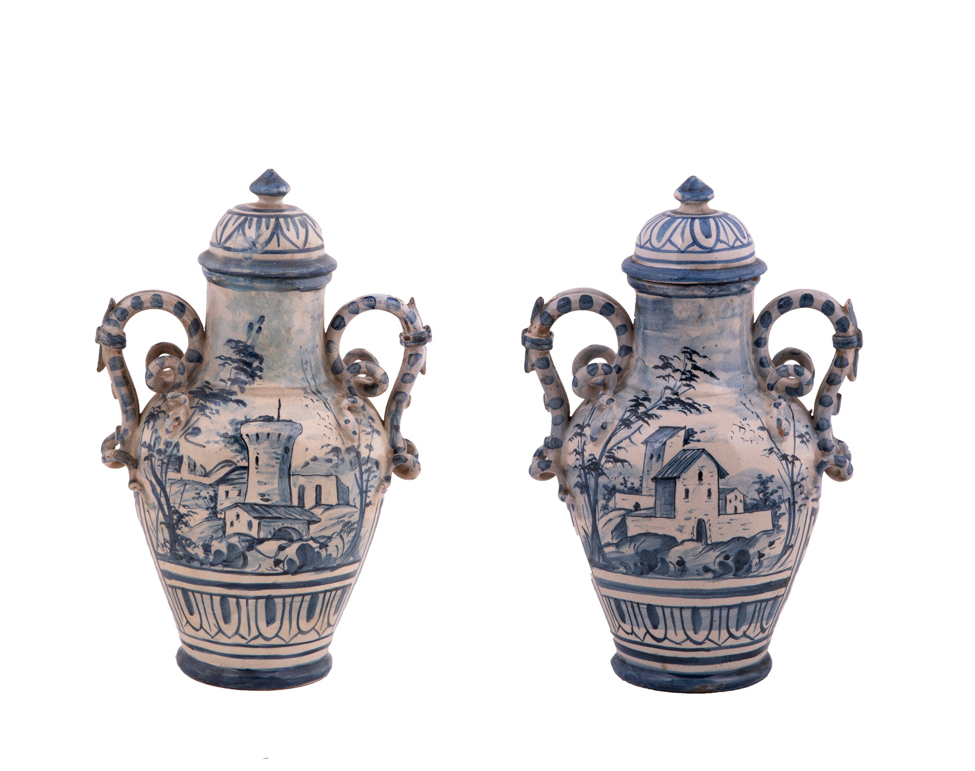 Coppia di vasi Savona con coperchio in ceramica bianca e blu XVIII secolo