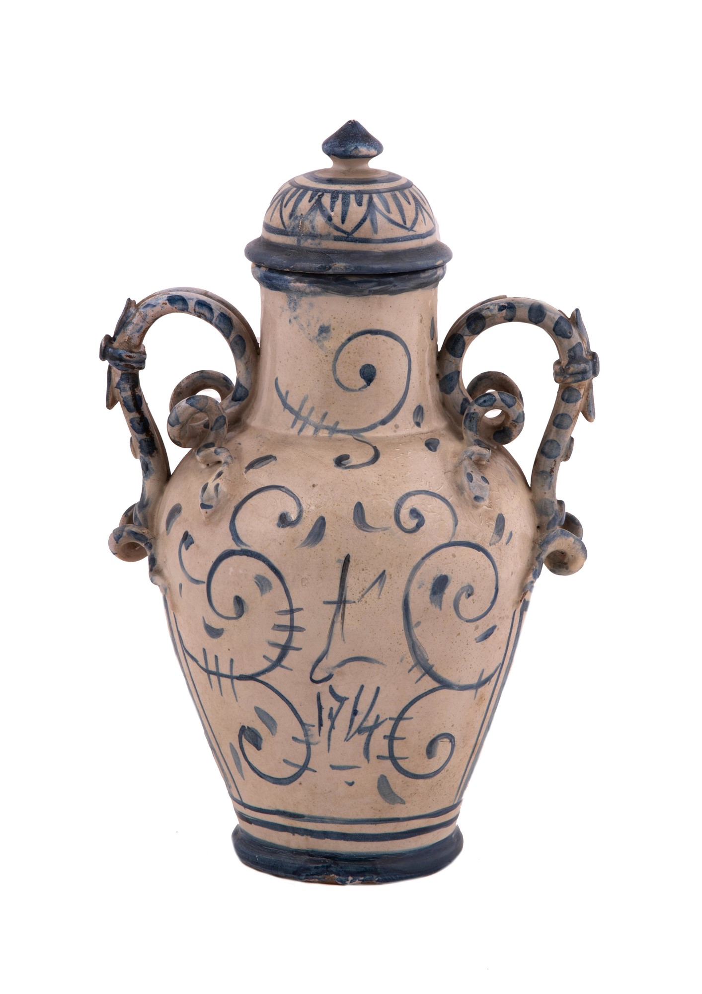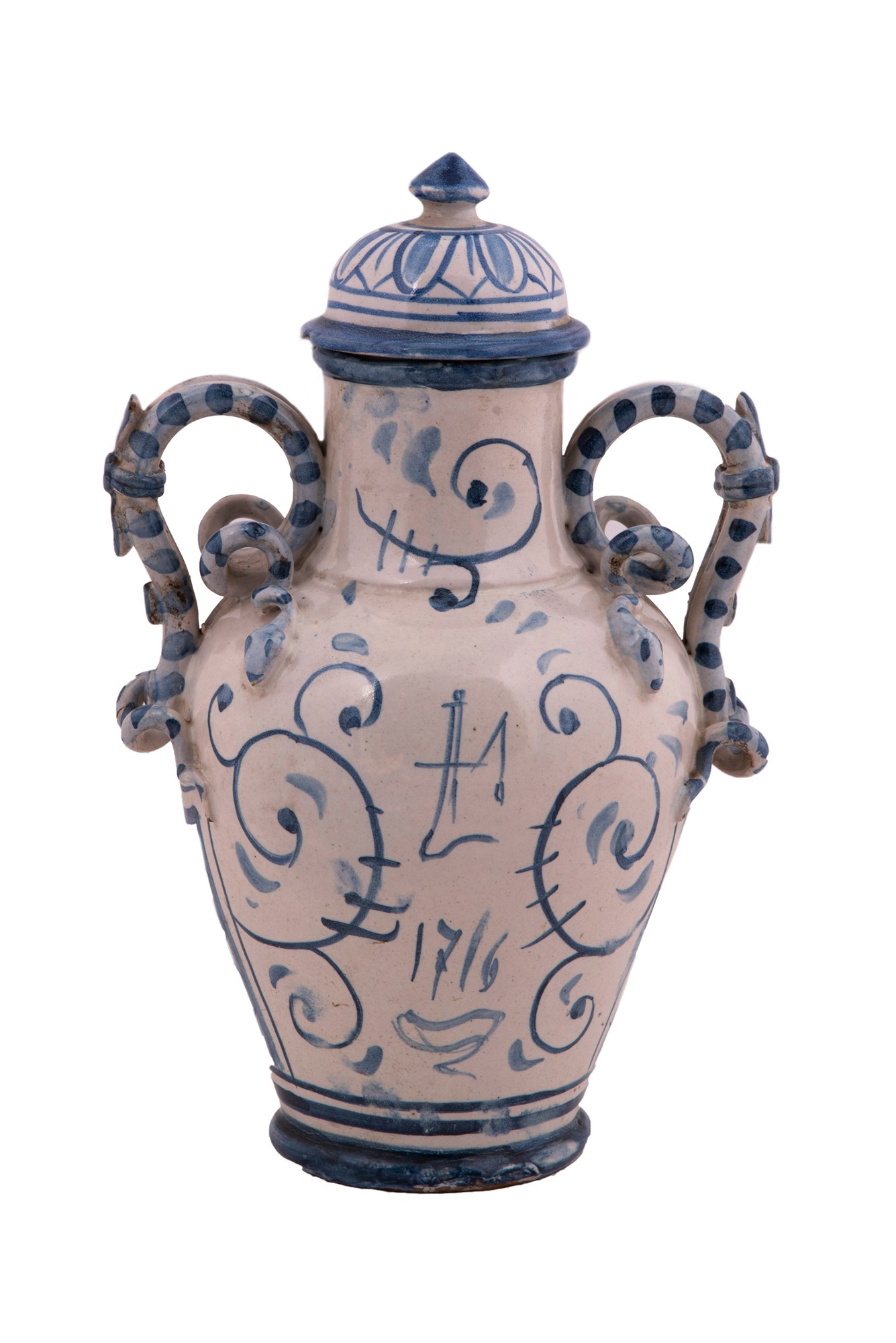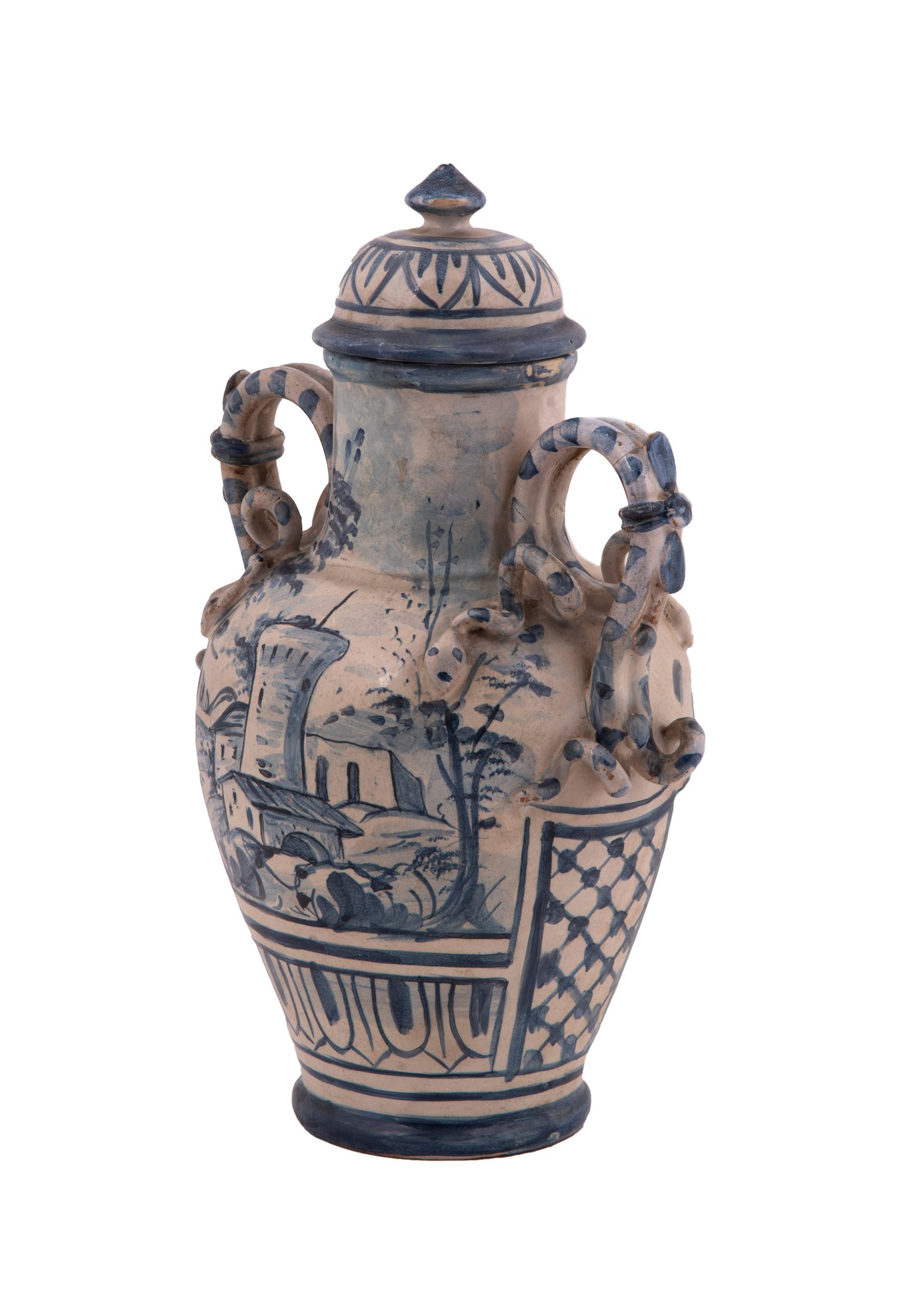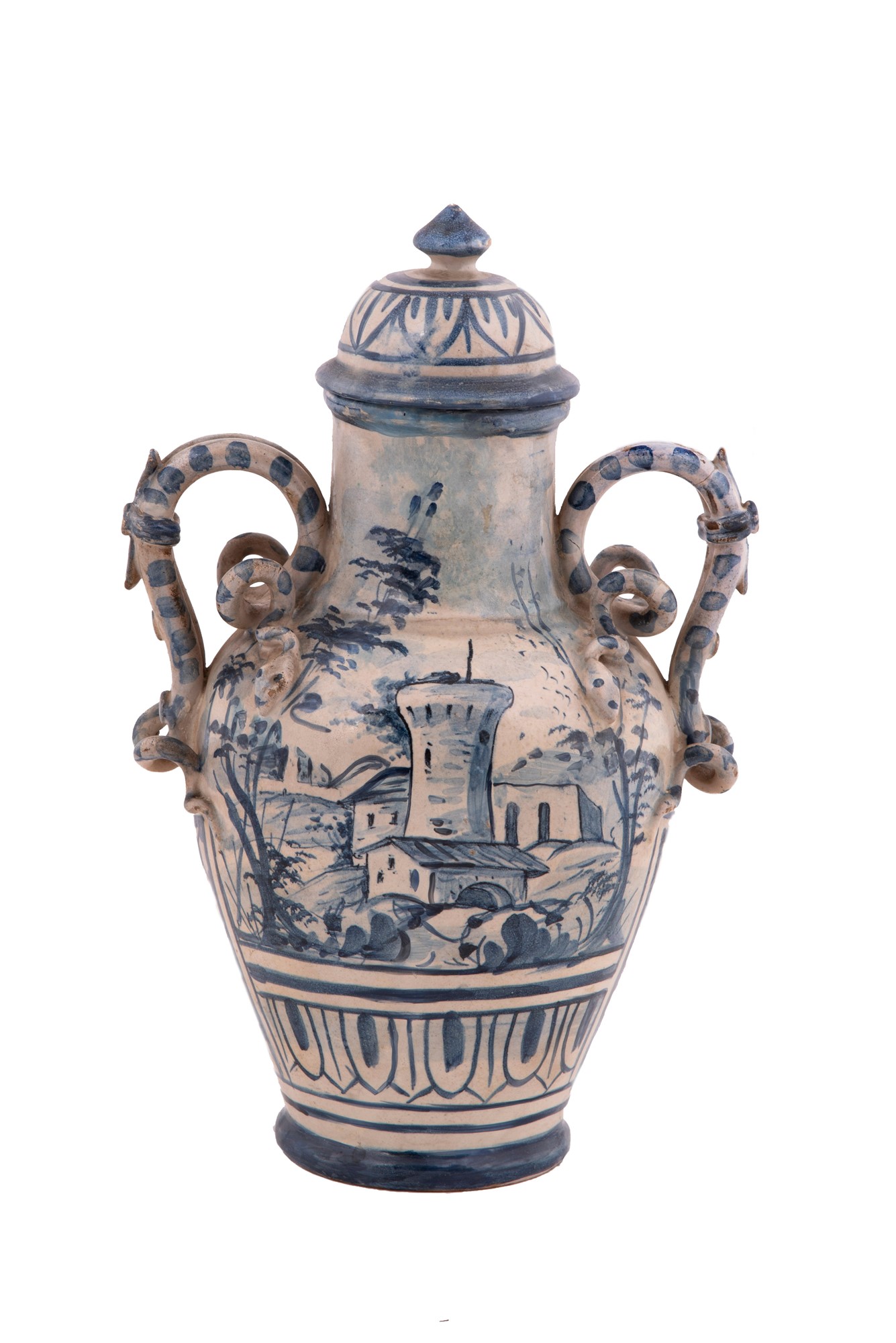 Coppia di vasi Savona con coperchio in ceramica bianca e blu XVIII secolo