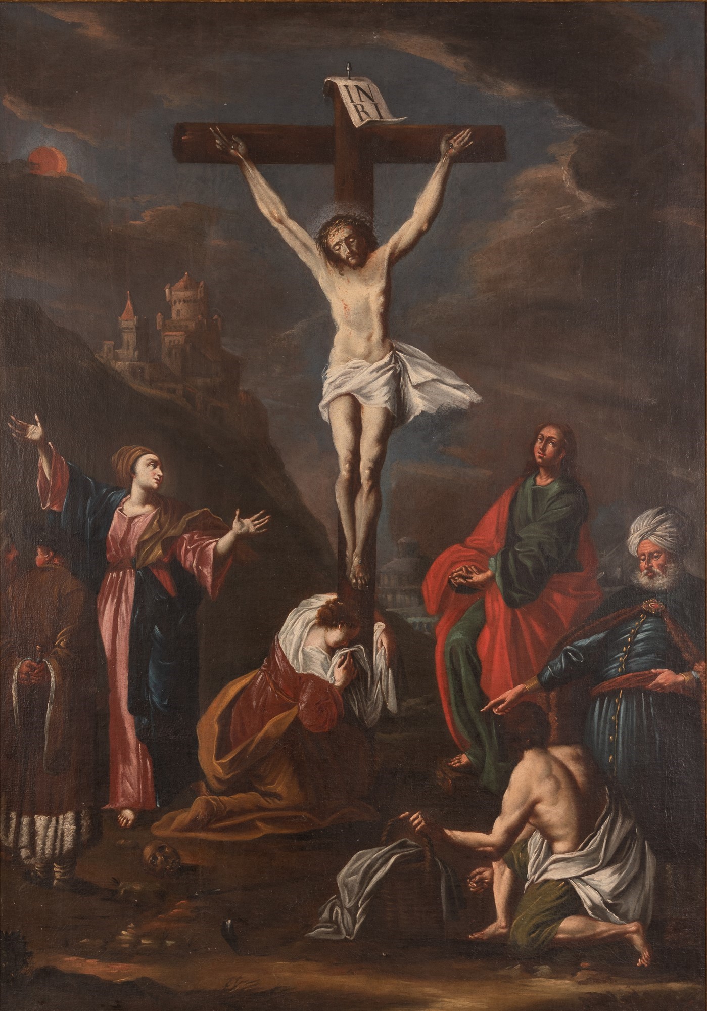 Olio su tela cm 125x88; con cornice cm 143x105 Olio su tela cm 125x88; con cornice cm 143x105 XVIII secolo Ai piedi di Gesù, in ginocchio e affranta, Maria Vergine, a sinistra con le braccia aperte Maria Maddalena, a destra San Giovanni mentre ha una visione. Completano il quadro una figura di giovane a torso nudo e girato che ha una mano su una cesta coperta da un telo e con l'altra regge una corda che esce dalla medesima; alla sua destra, in piedi, una figura di vecchio con turbante che indica a terra. A sinistra del quadro, girati, due dignitari di spalle che parlano, uno di essi regge dietro la schiena un bastone dal pomo dorato. Dietro la croce si intravede un tempio, mentre sul lato della montagna una città turrita.