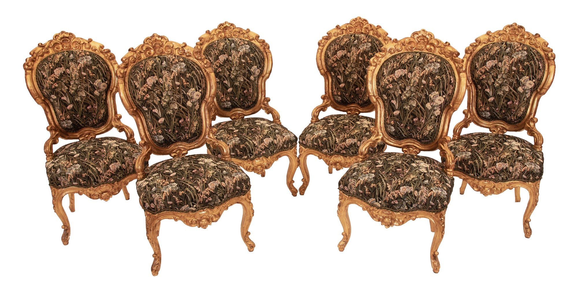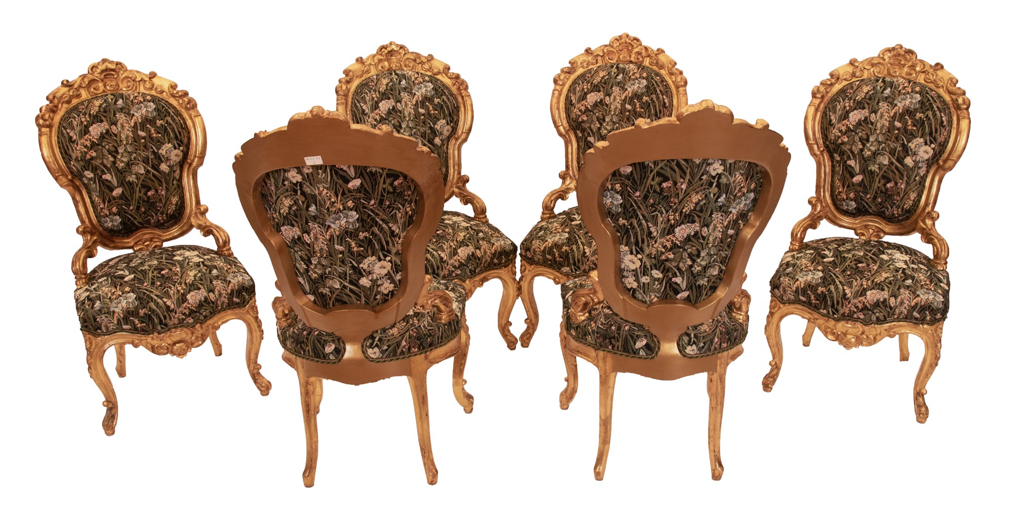 6 sedie dorate con schienale e seduta rivestiti in tessuto decorato a motivi floreali XIX secolo