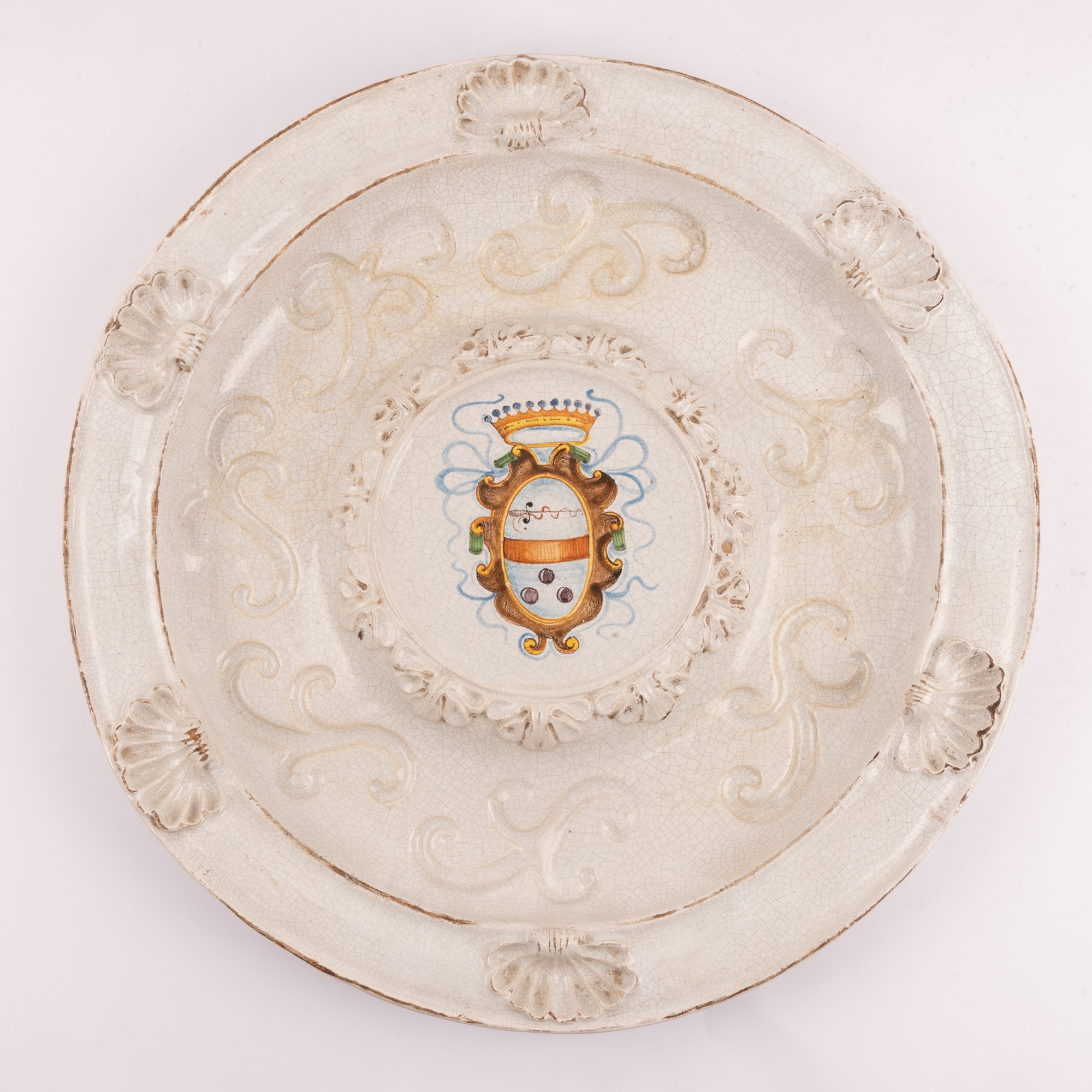 Grande centrotavola in ceramica bianca arricchito da stemma nobiliare Ø cm 61