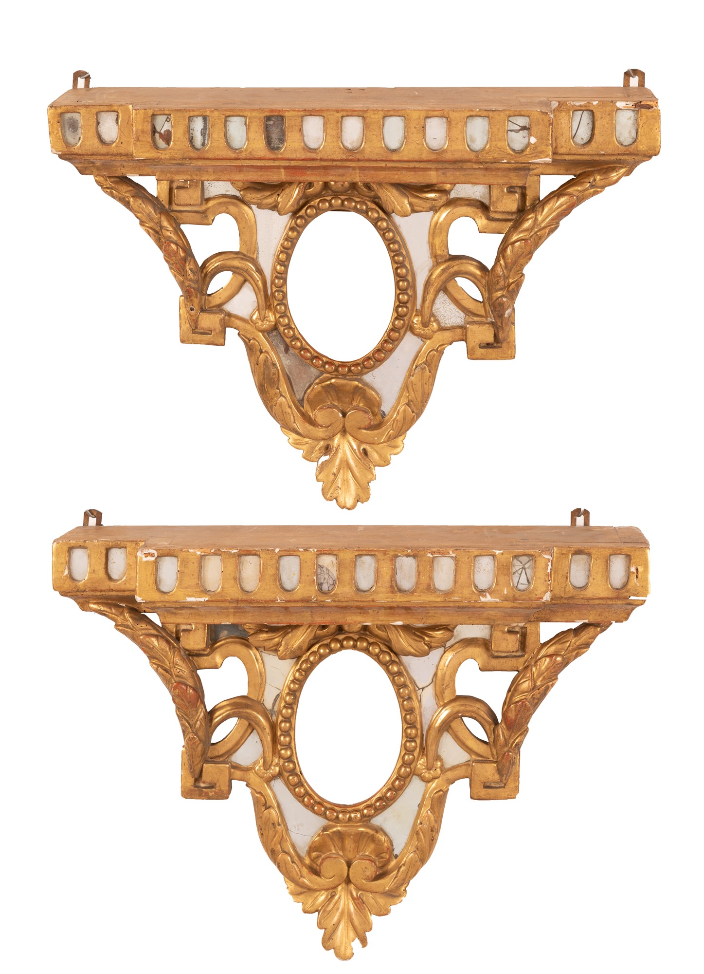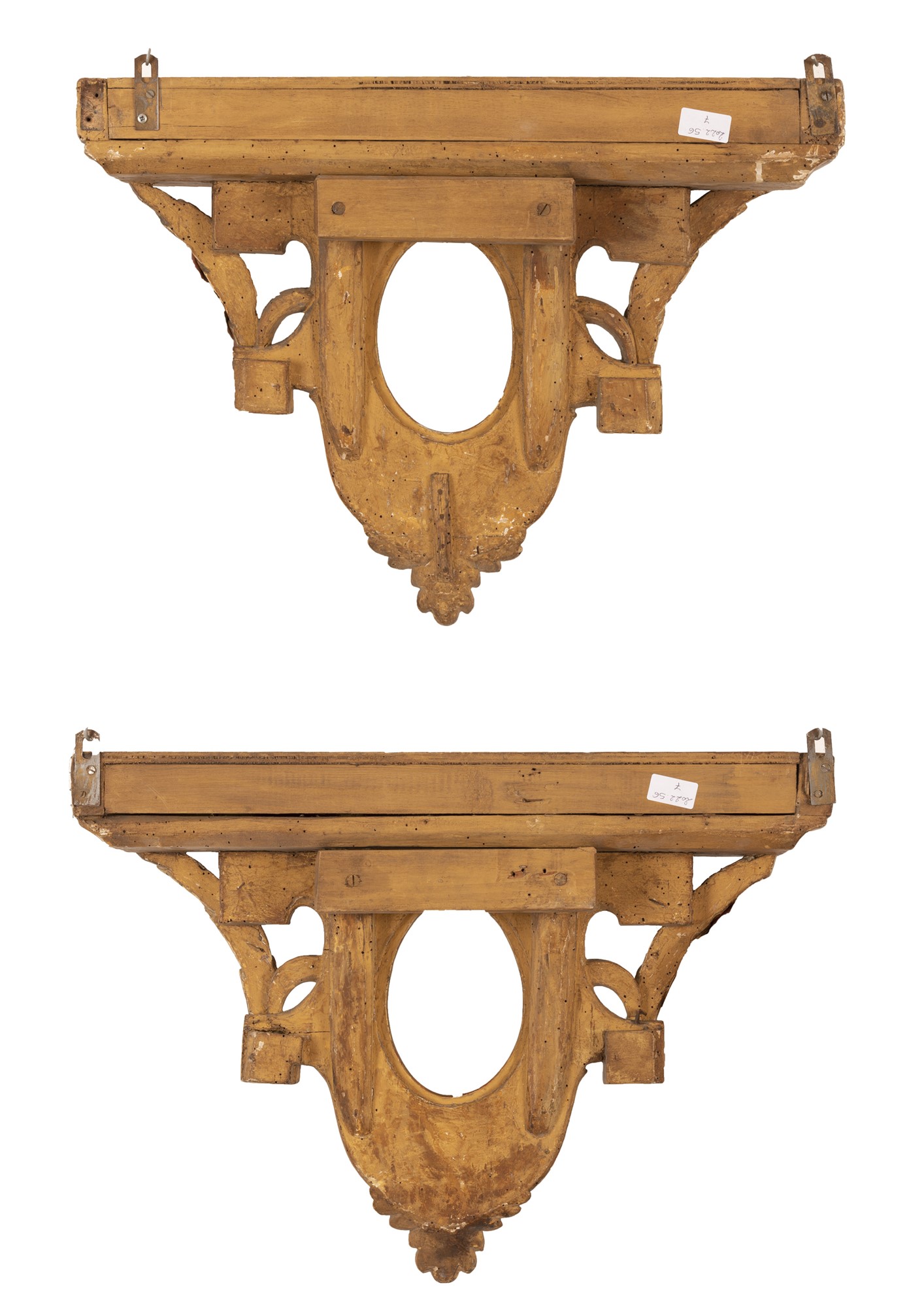 Coppia di piccole mensole in legno dorato e intagliato a motivi vegetali. XIX secolo