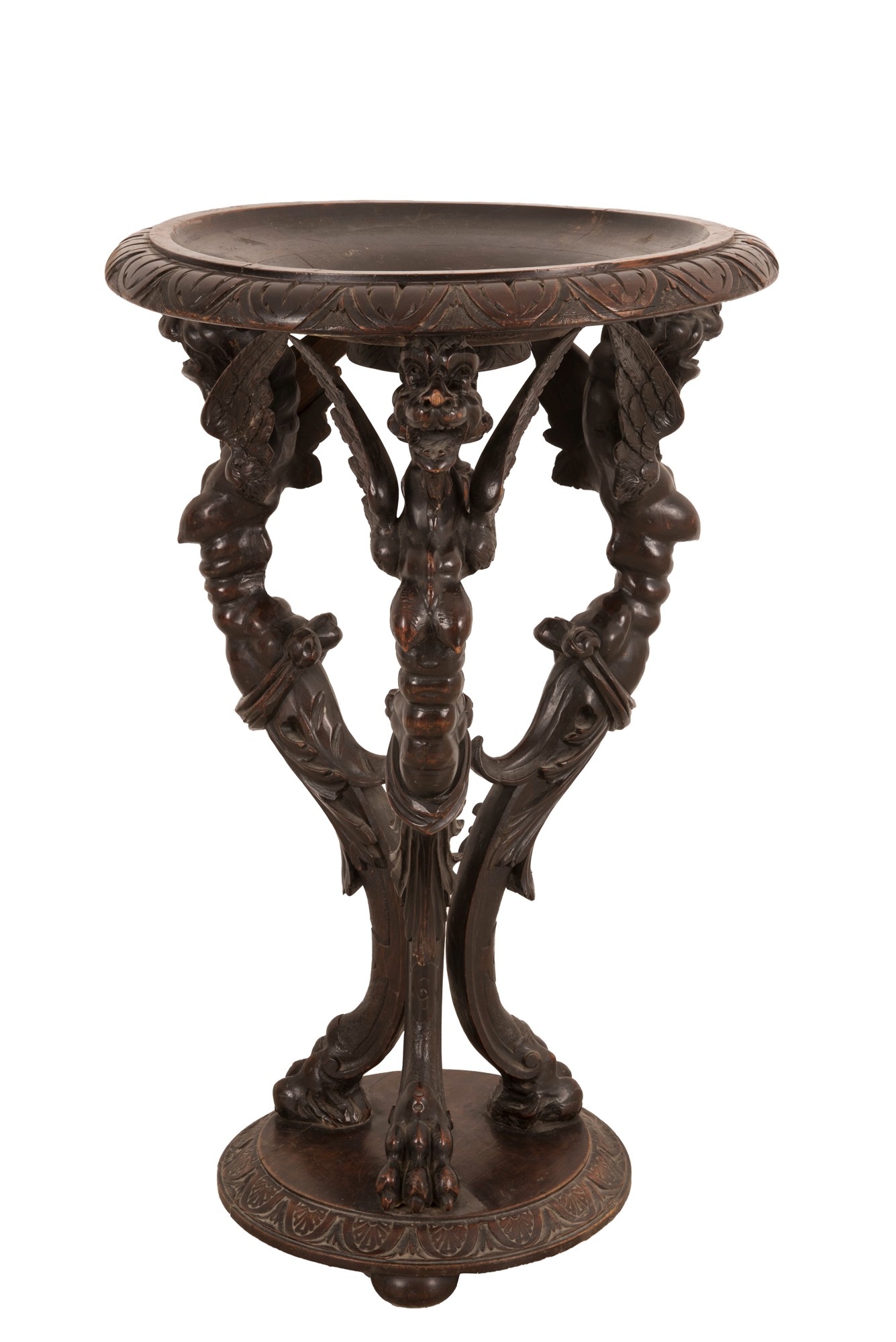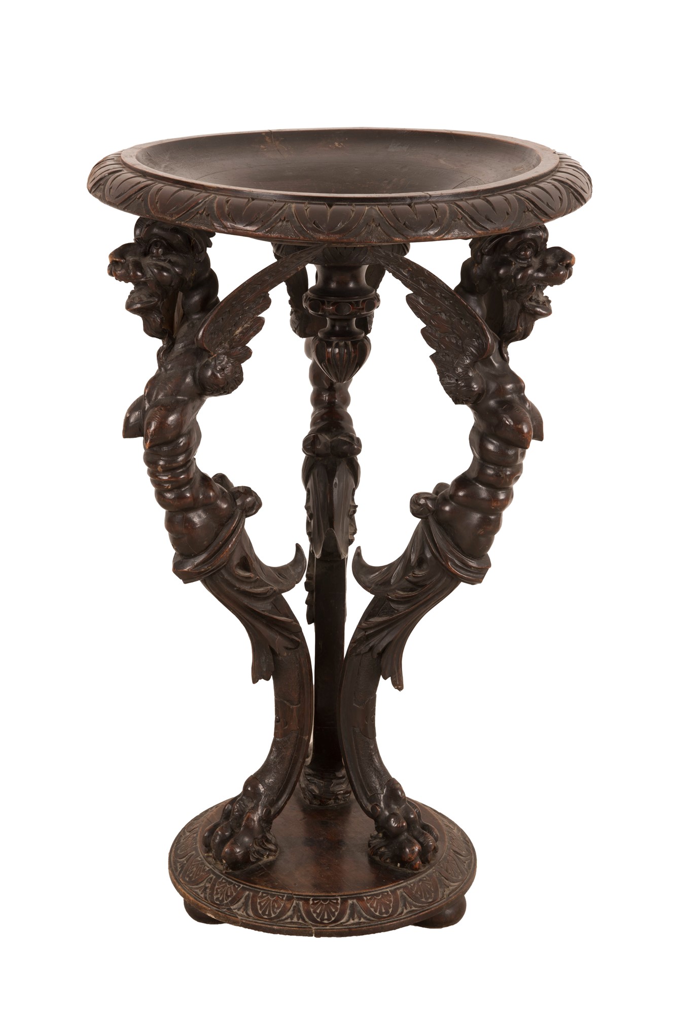 Braciere in noce con piano circolare sorretto da tre gambe raffiguranti arpie XIX secolo