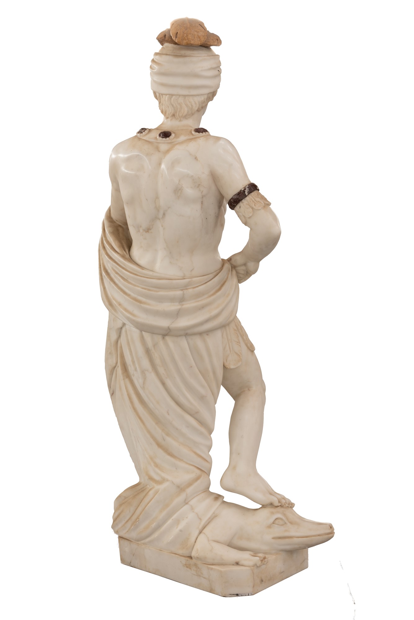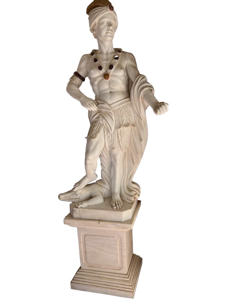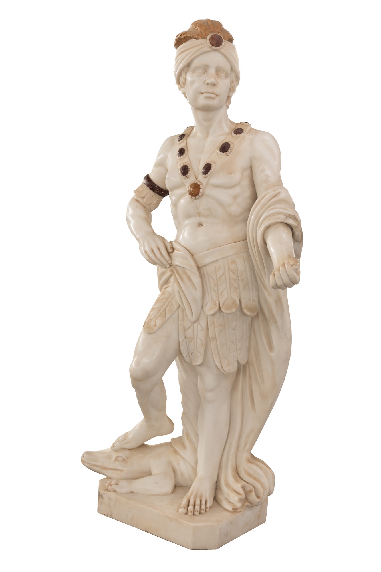 cm 153x81; base 63x53x40 cm 153x81; base 63x53x40 Statua di marmo raffigurante uomo a torso nudo che indossa un turbante con pennacchio fermato da un grande diadema e una fascia scapolare ingioiellata con pietre dure di diversi colori, possibili simboli di uno status regale.