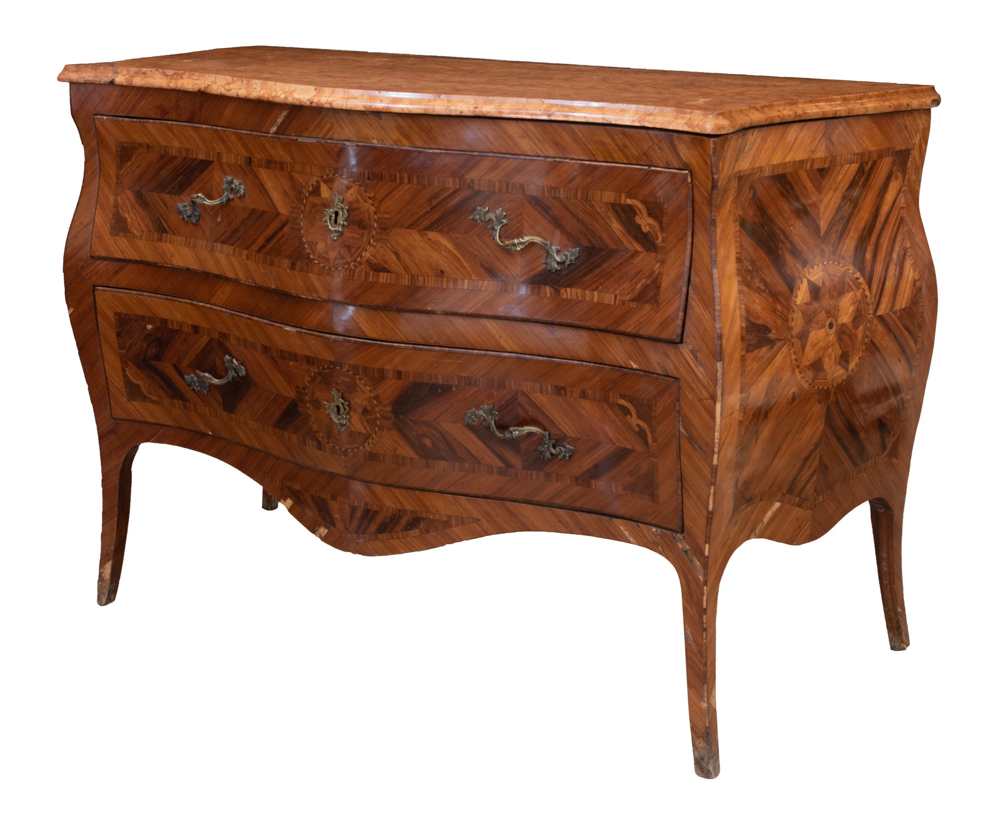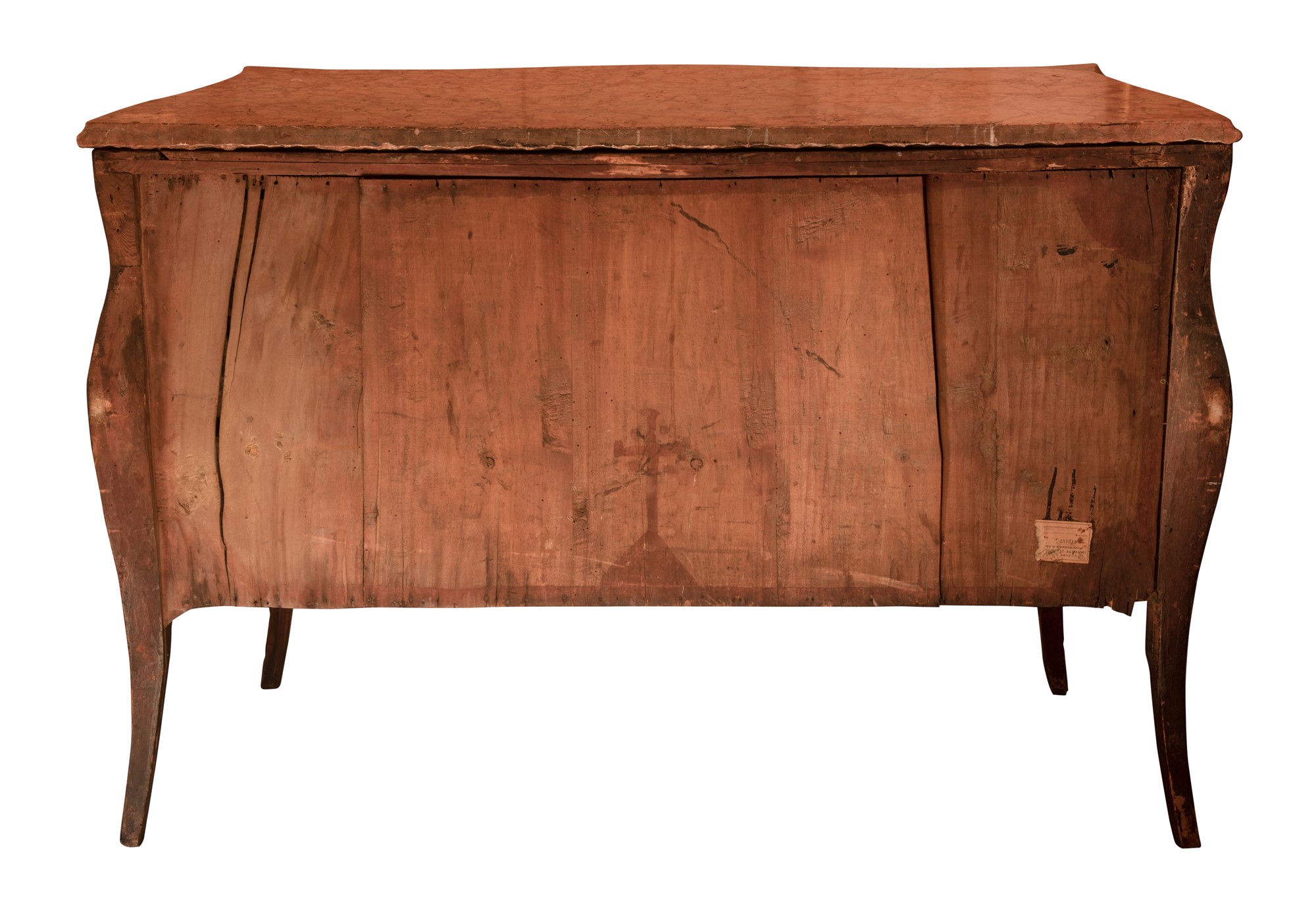 Cassettone Napoli lastronato in palissandro e intarsiato in bois de rose. Piano in marmo rosso di Verona Primo quarto XVIII secolo