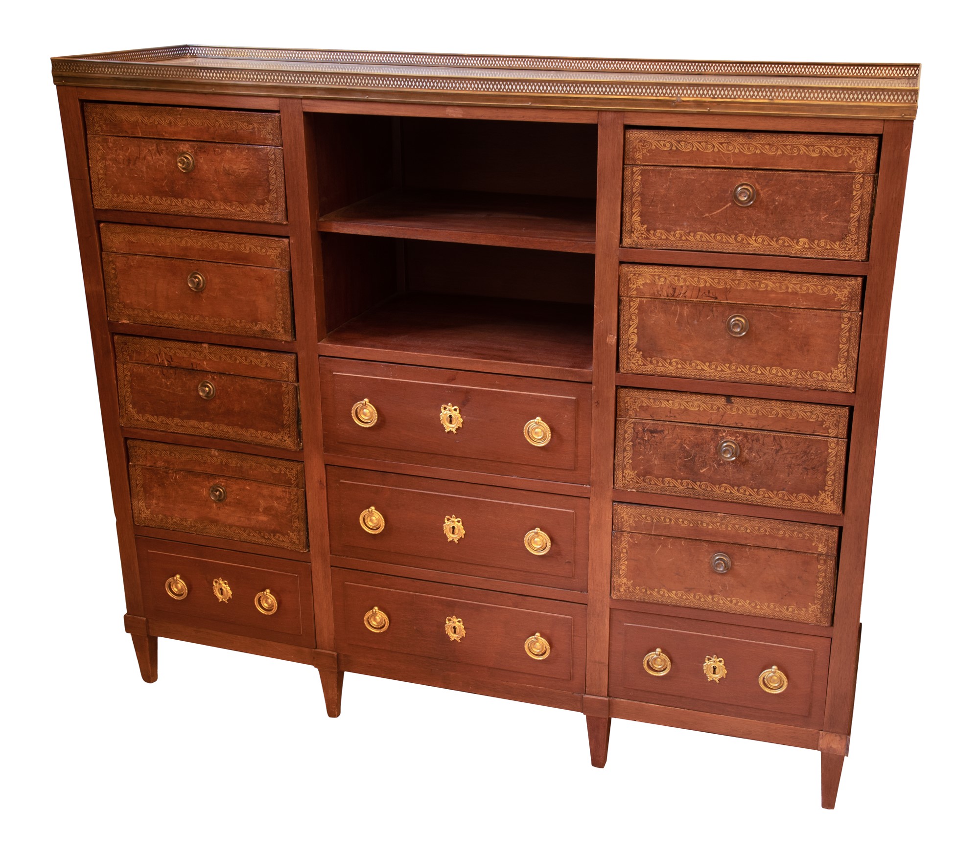 Mobile cartonnier in mogano con otto cassetti in pelle impressi in oro nei montanti e cinque di cui tre in linea con guarnizioni in bronzo.