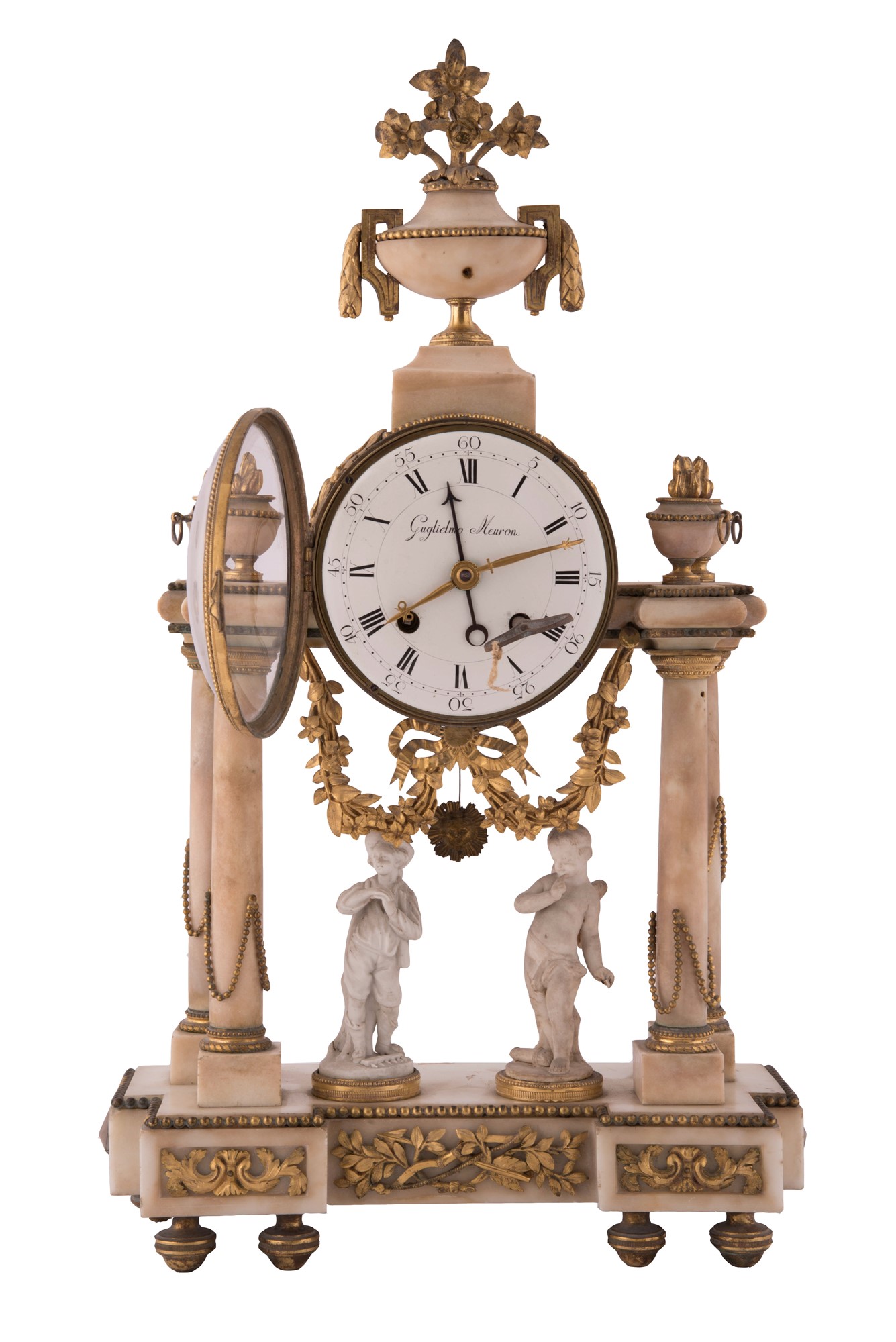 Colonne raccordate da orologio con quadrante circolare a fondo bianco firmato Guglielmo Meuron.