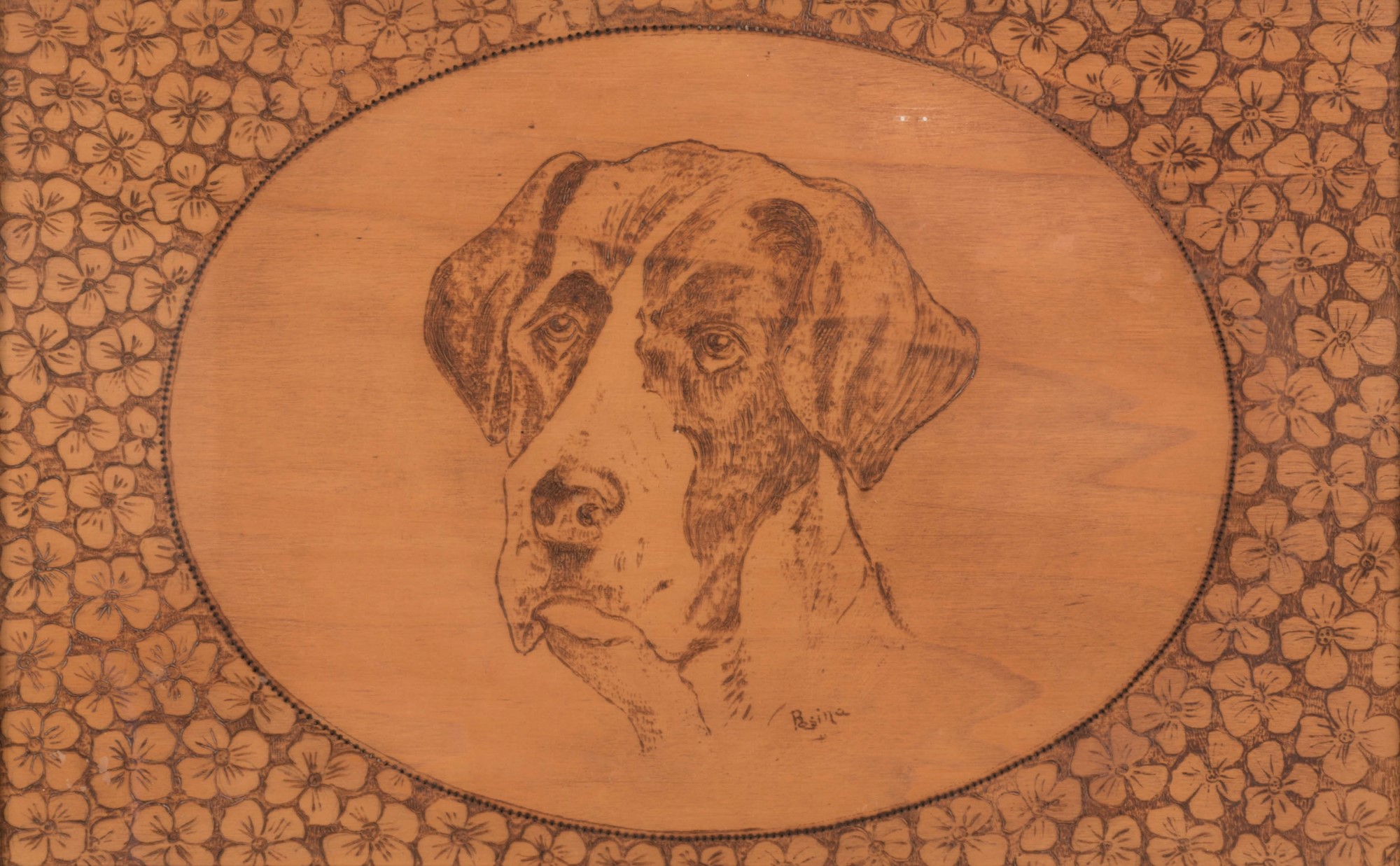 Tarsia in legno raffigurante cane cm 28x44; con cornice cm 44x61