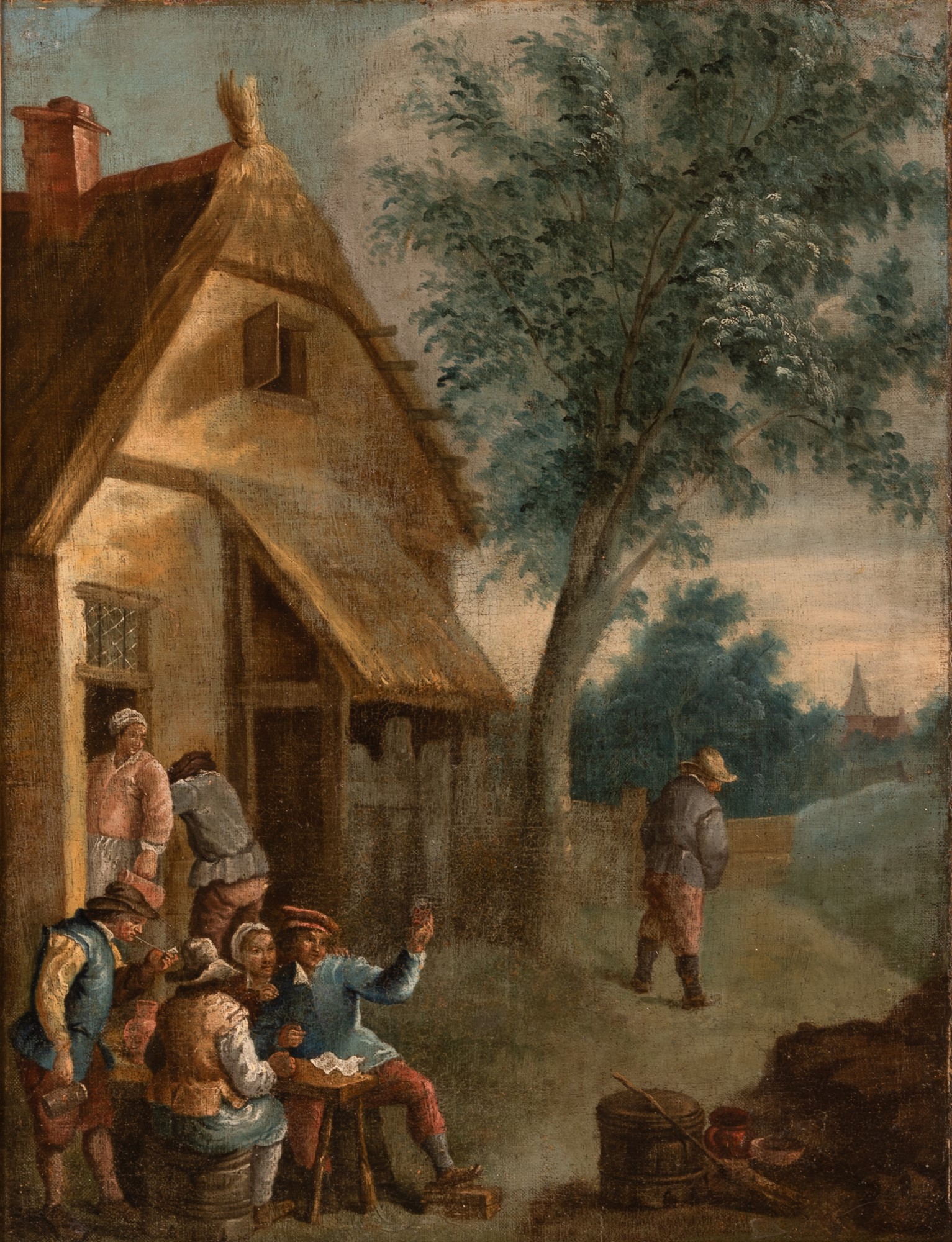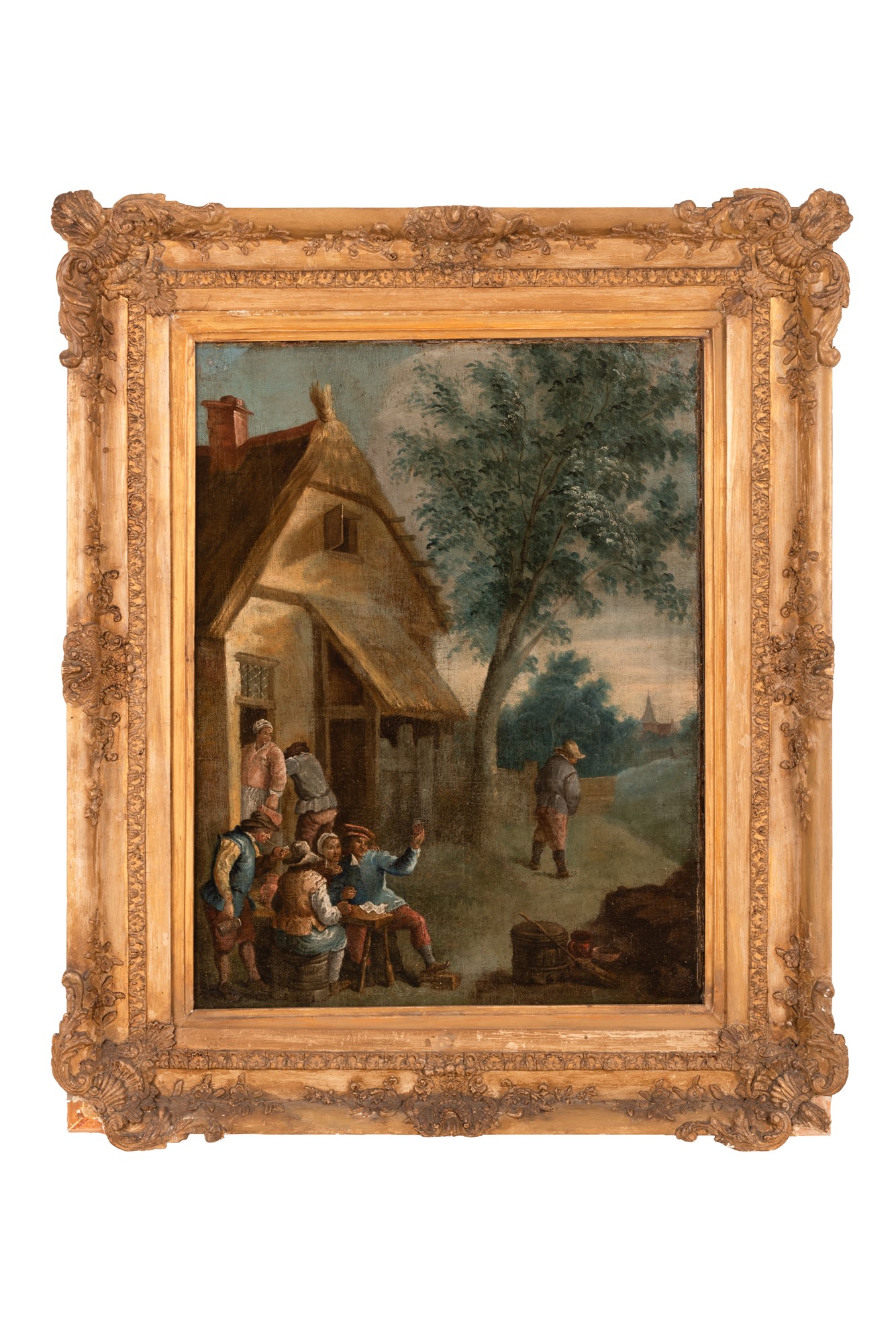 Pittore fiammingo del XVIII secolo ( - ) Scena di taverna con bevitori olio su tela cm 68x52; con cornice cm 94x77