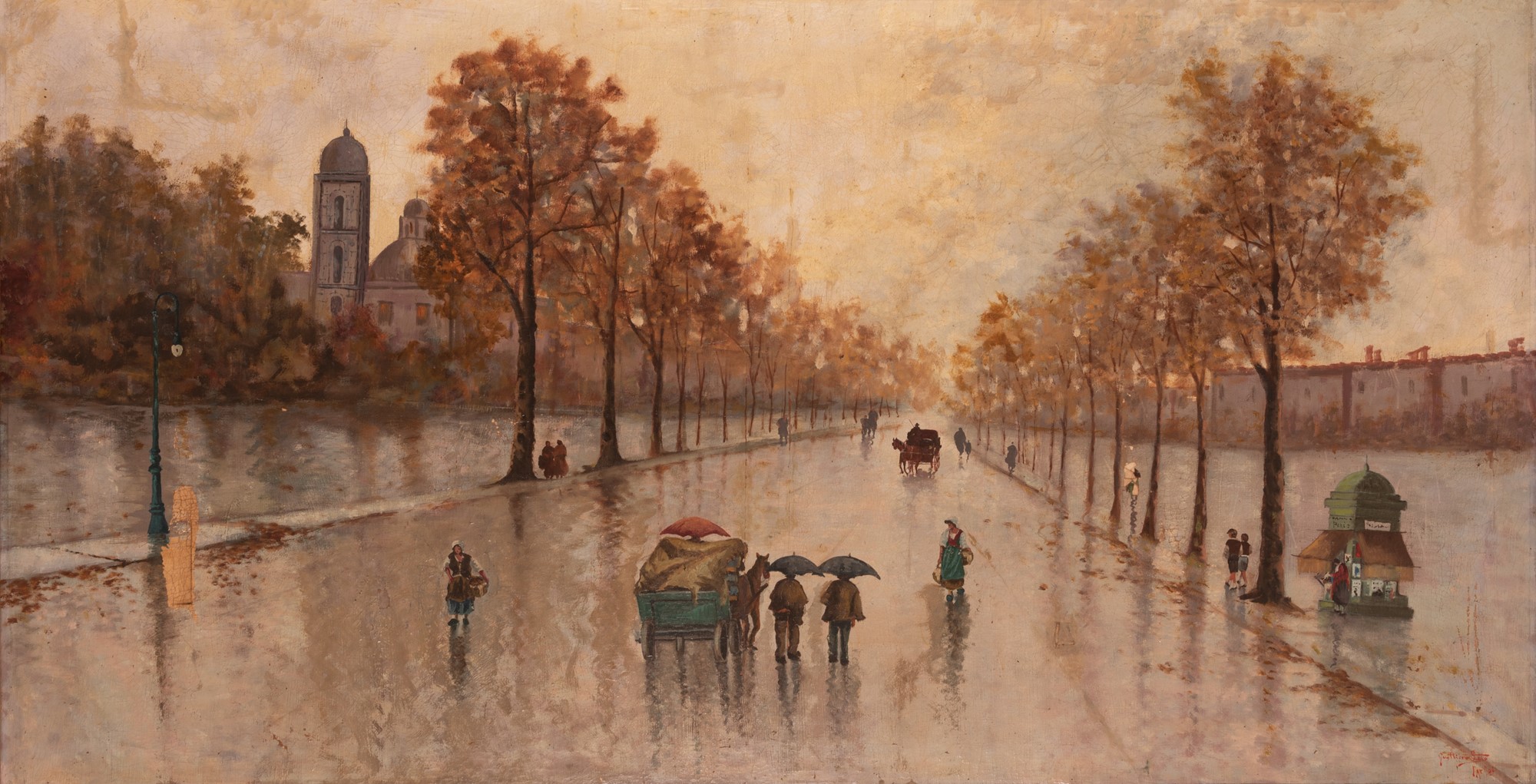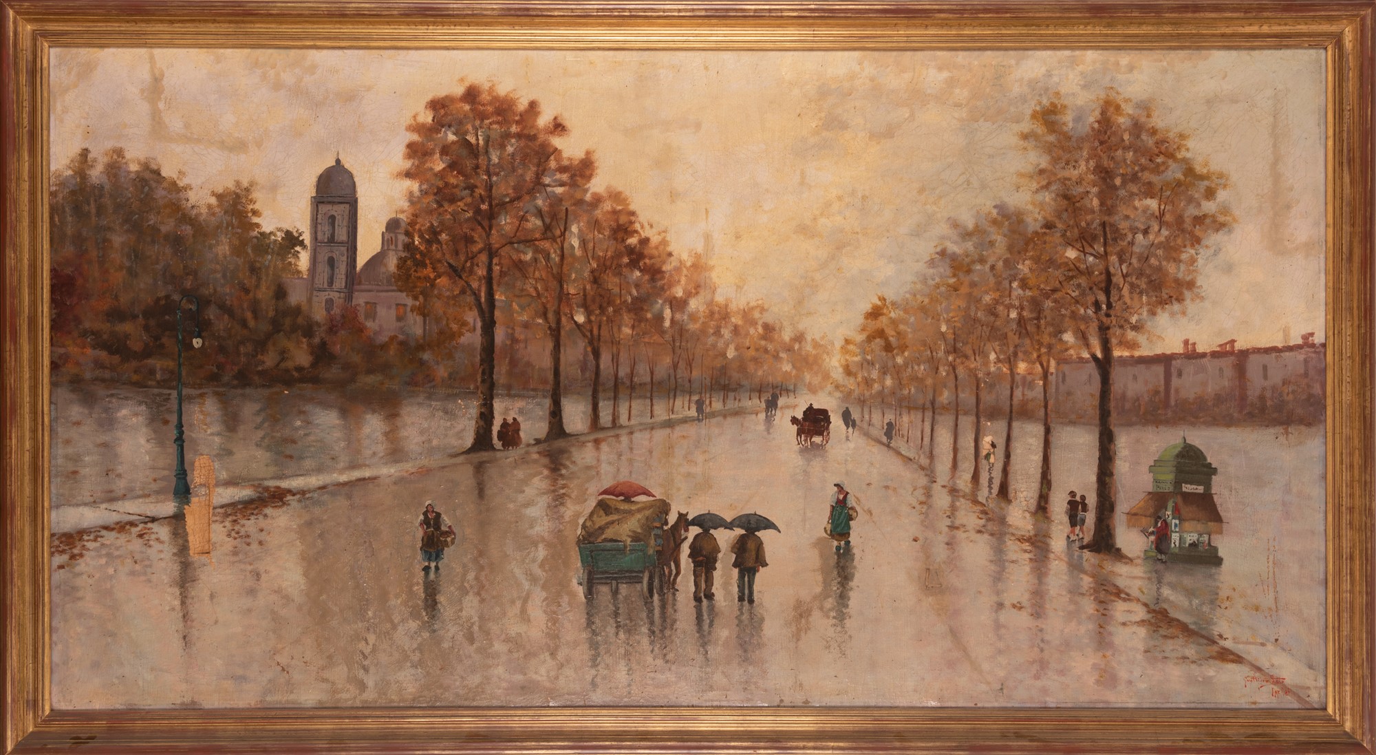 Strade di Parigi Olio su tela cm 98x188; con cornice cm 114x204