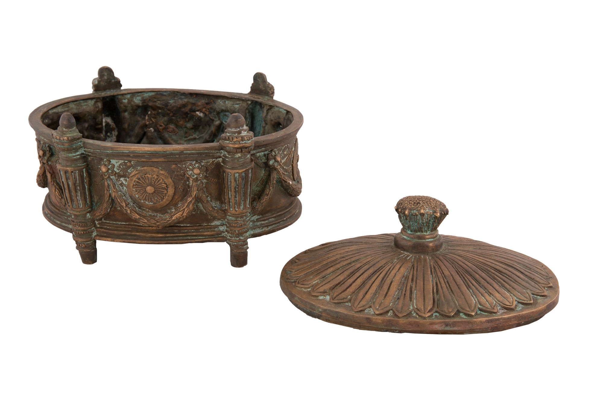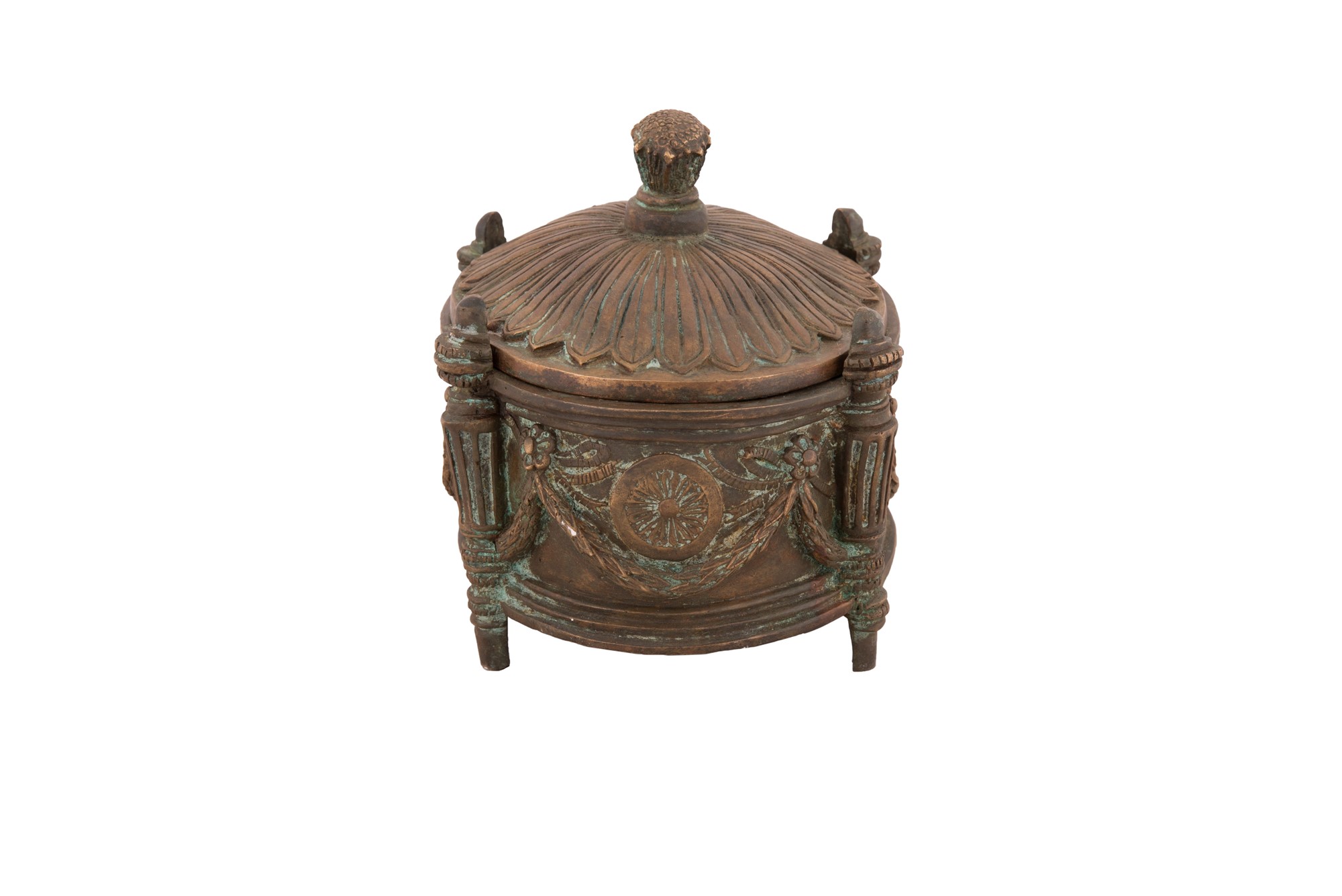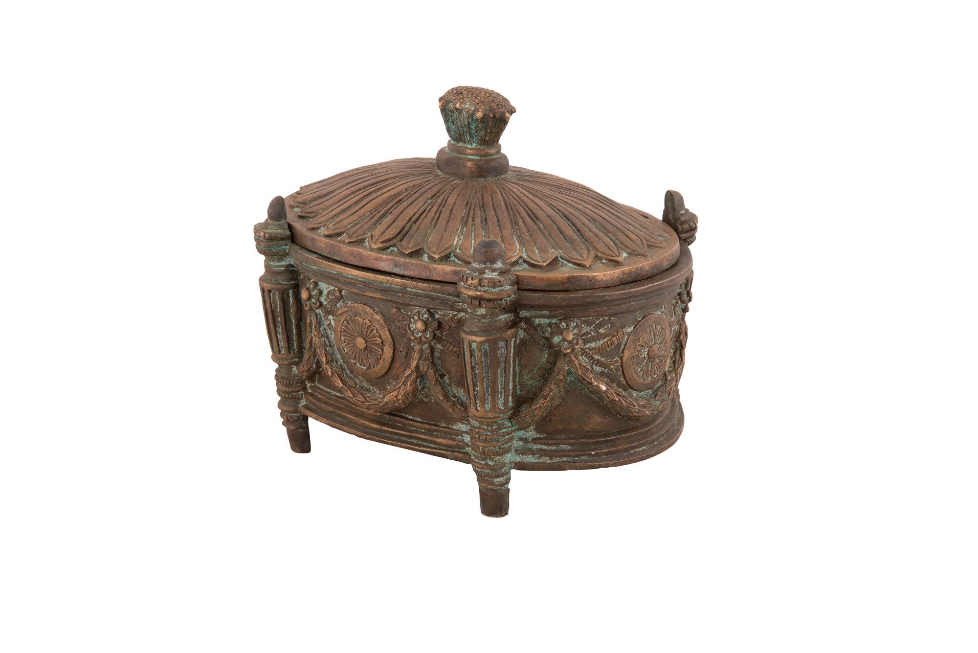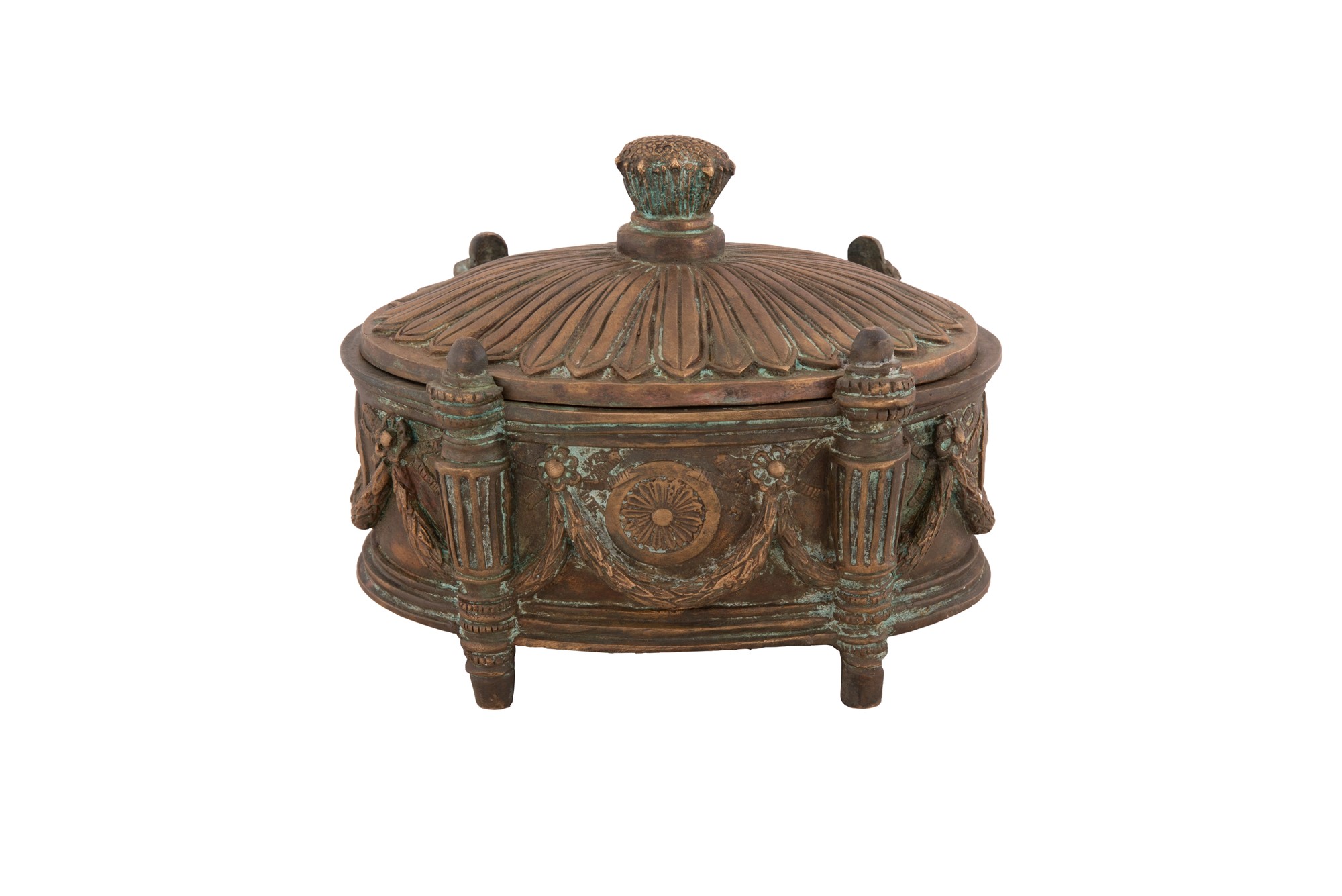 Scatola in bronzo con coperchio tipo Impero cesellata ai bordi con festoni e ruote di carro XX secolo