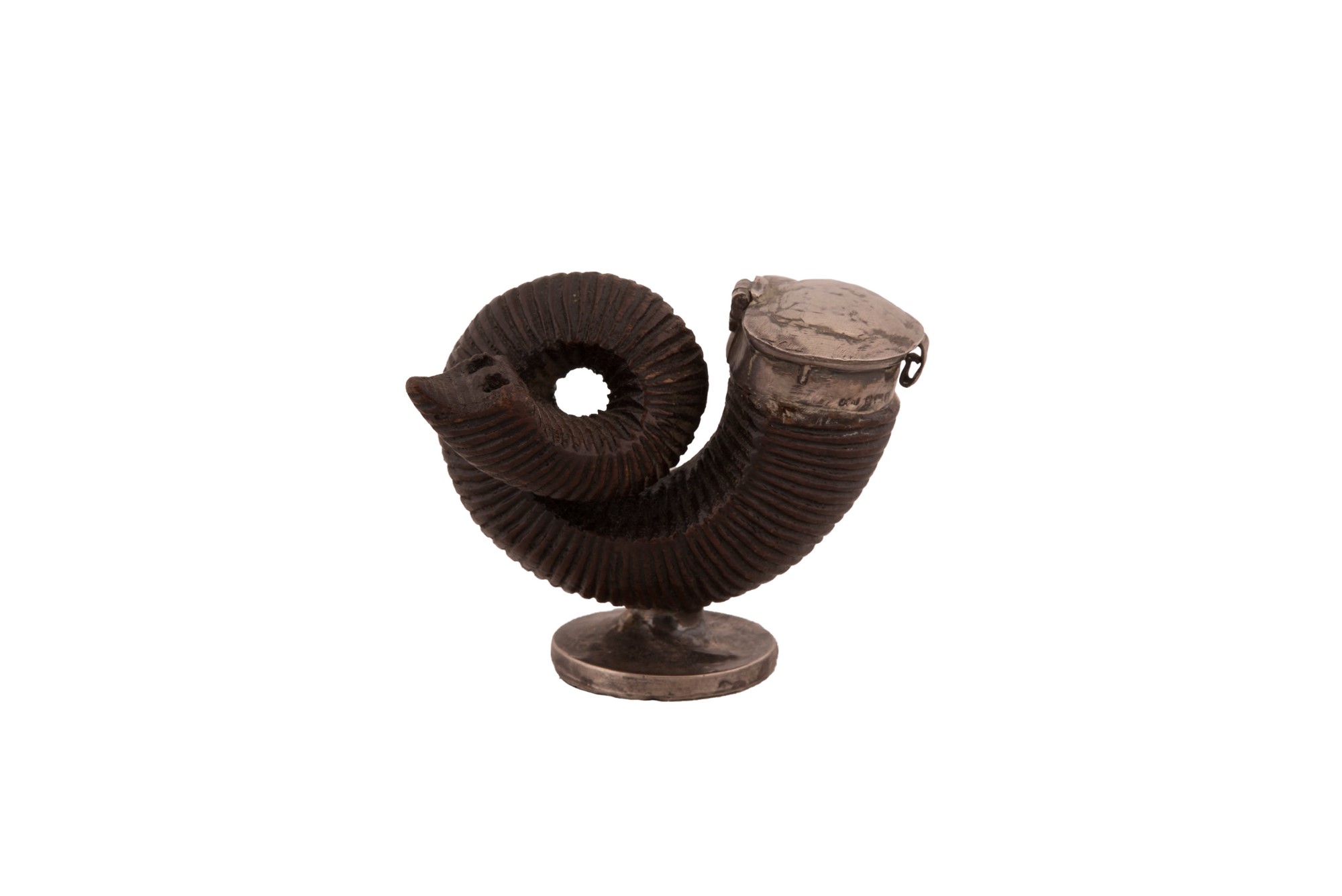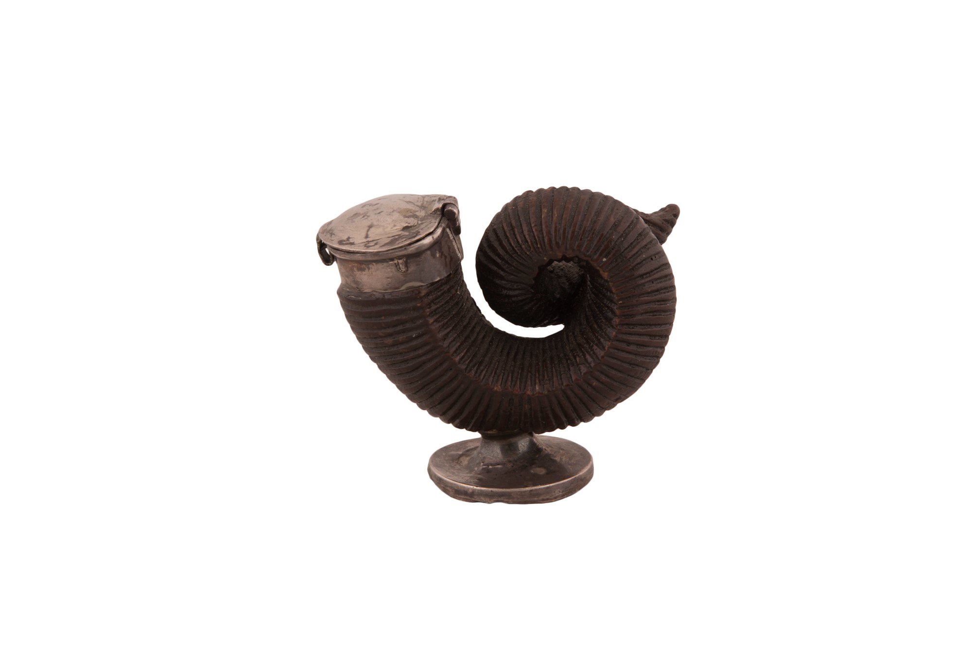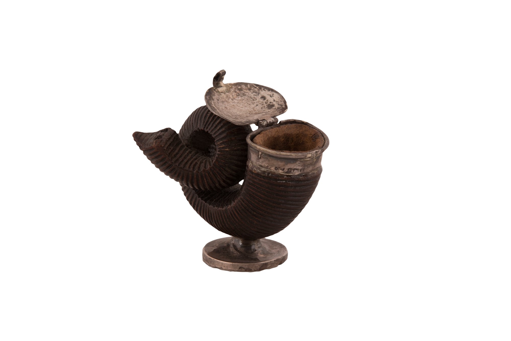 Tabacchiera per tabacco da fiuto da tavolo fatta a forma di proboscide in legno e coperchio in argento XIX secolo