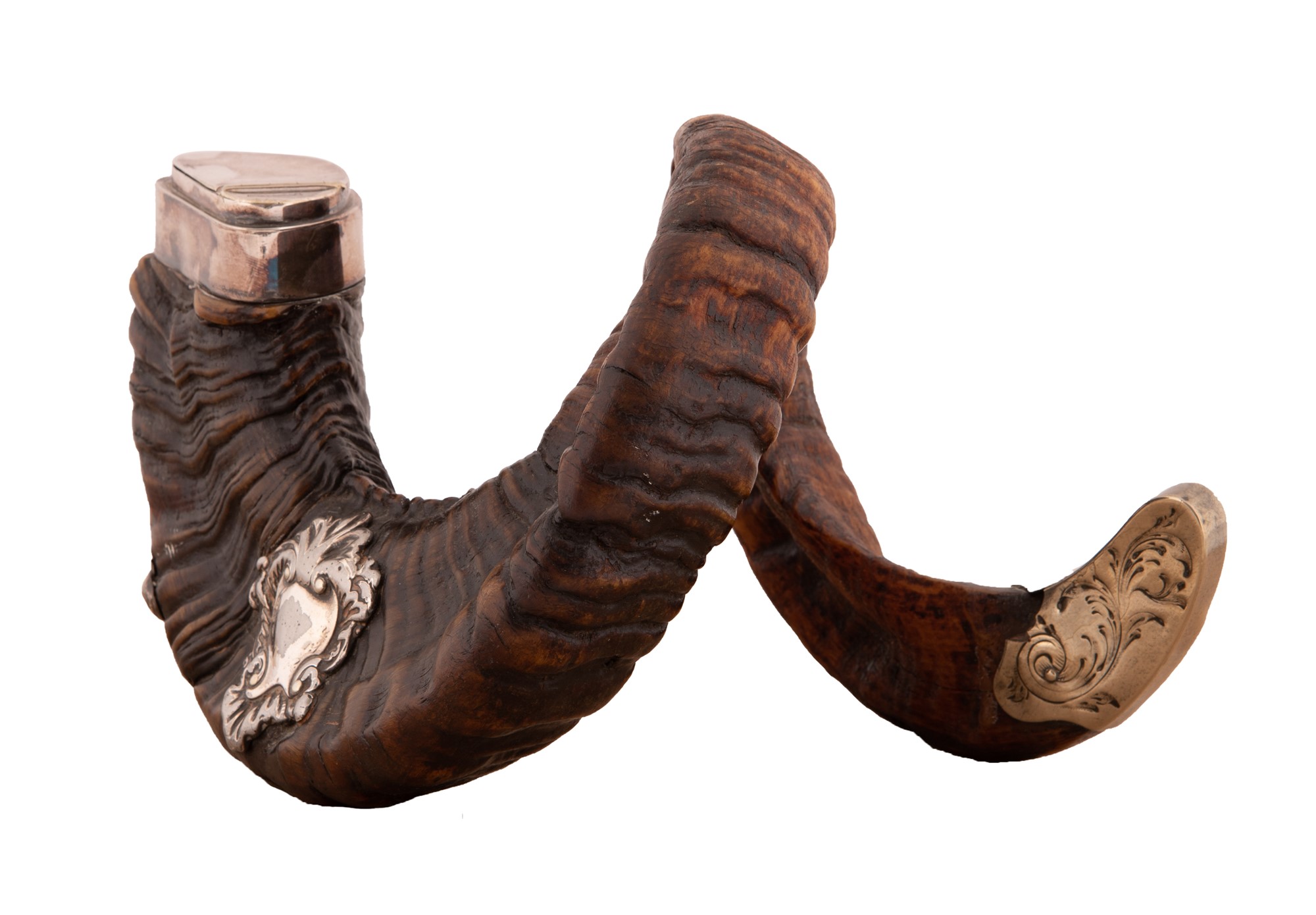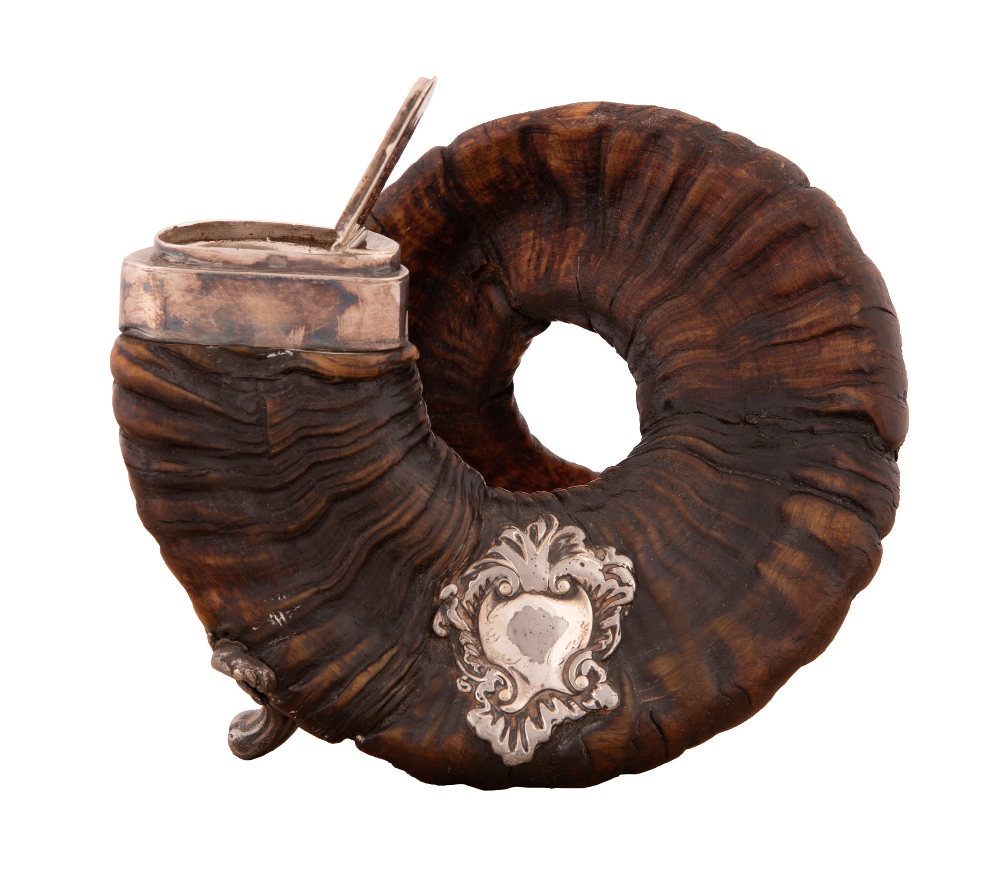 Corno di muflone con applicazioni in argento XIX secolo cm 25x32x12