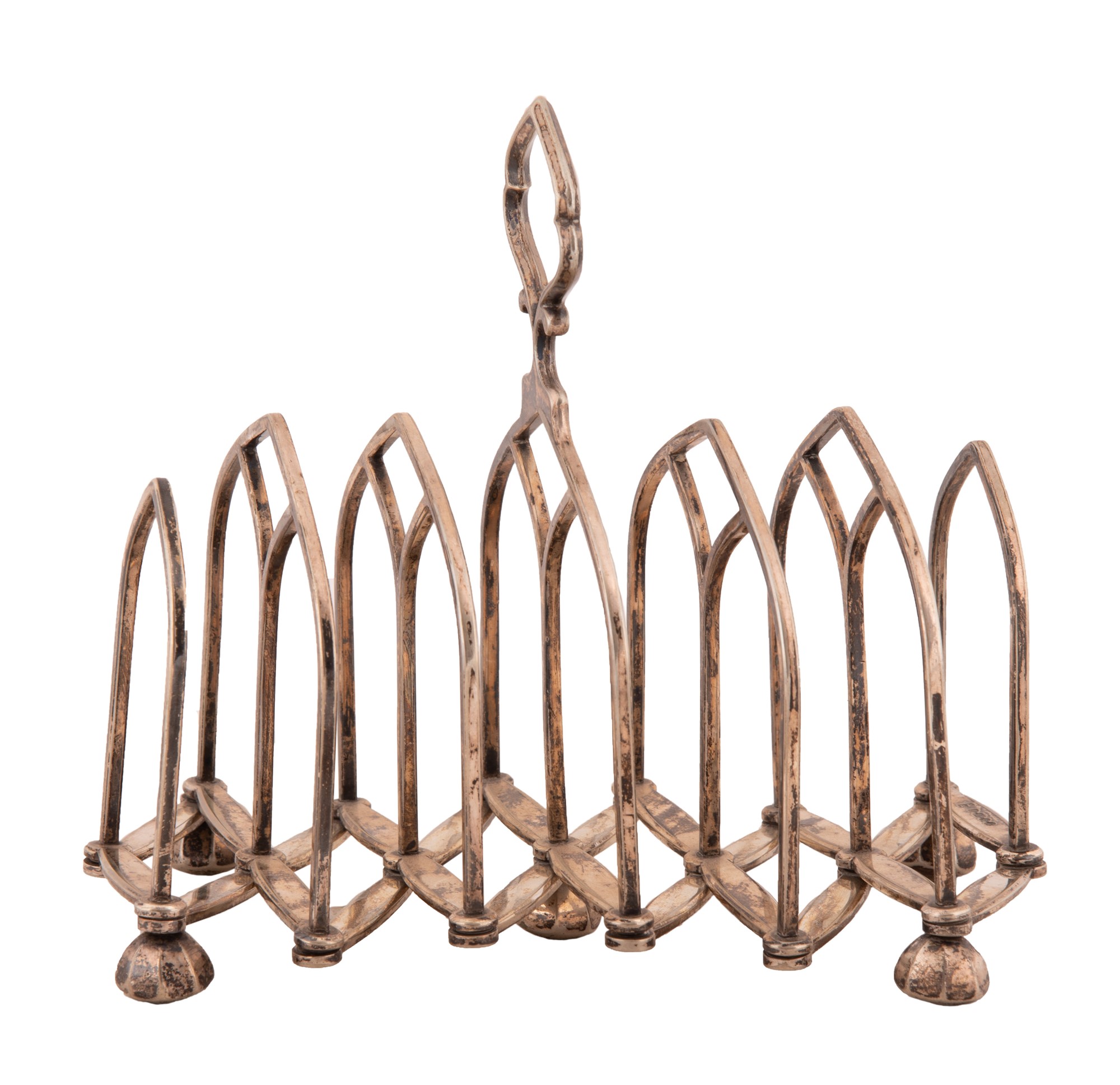 Portatoast da viaggio in metallo argentato con grazioso meccanismo e apertura a libretto XX secolo