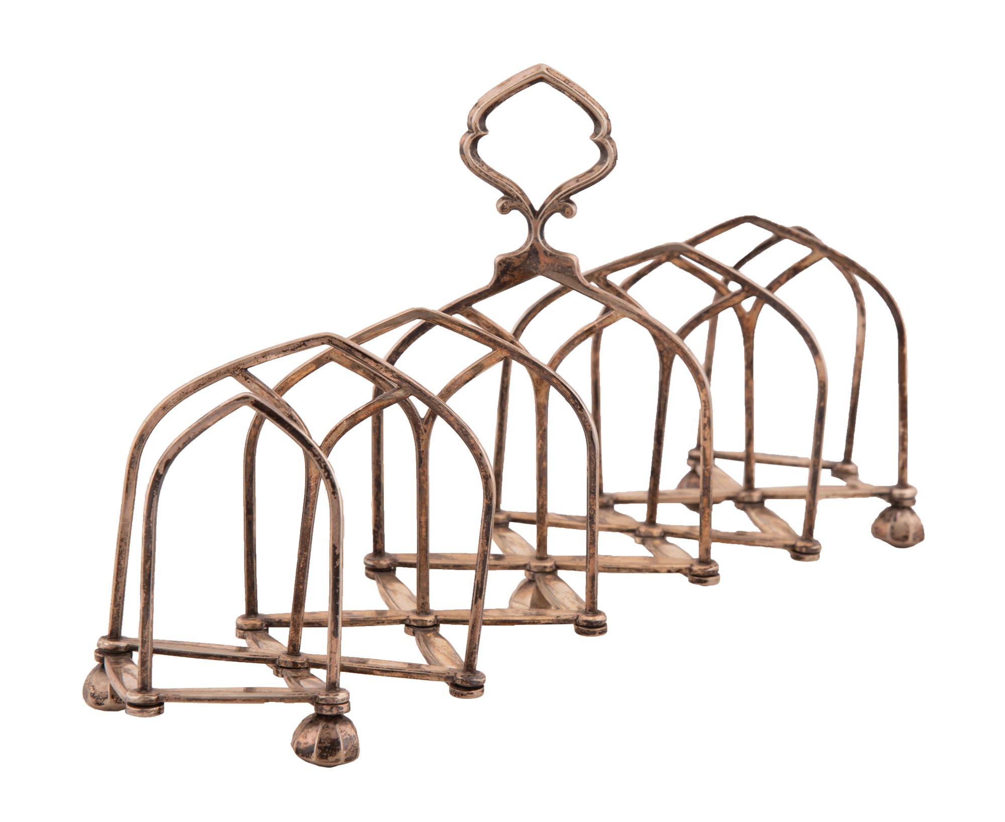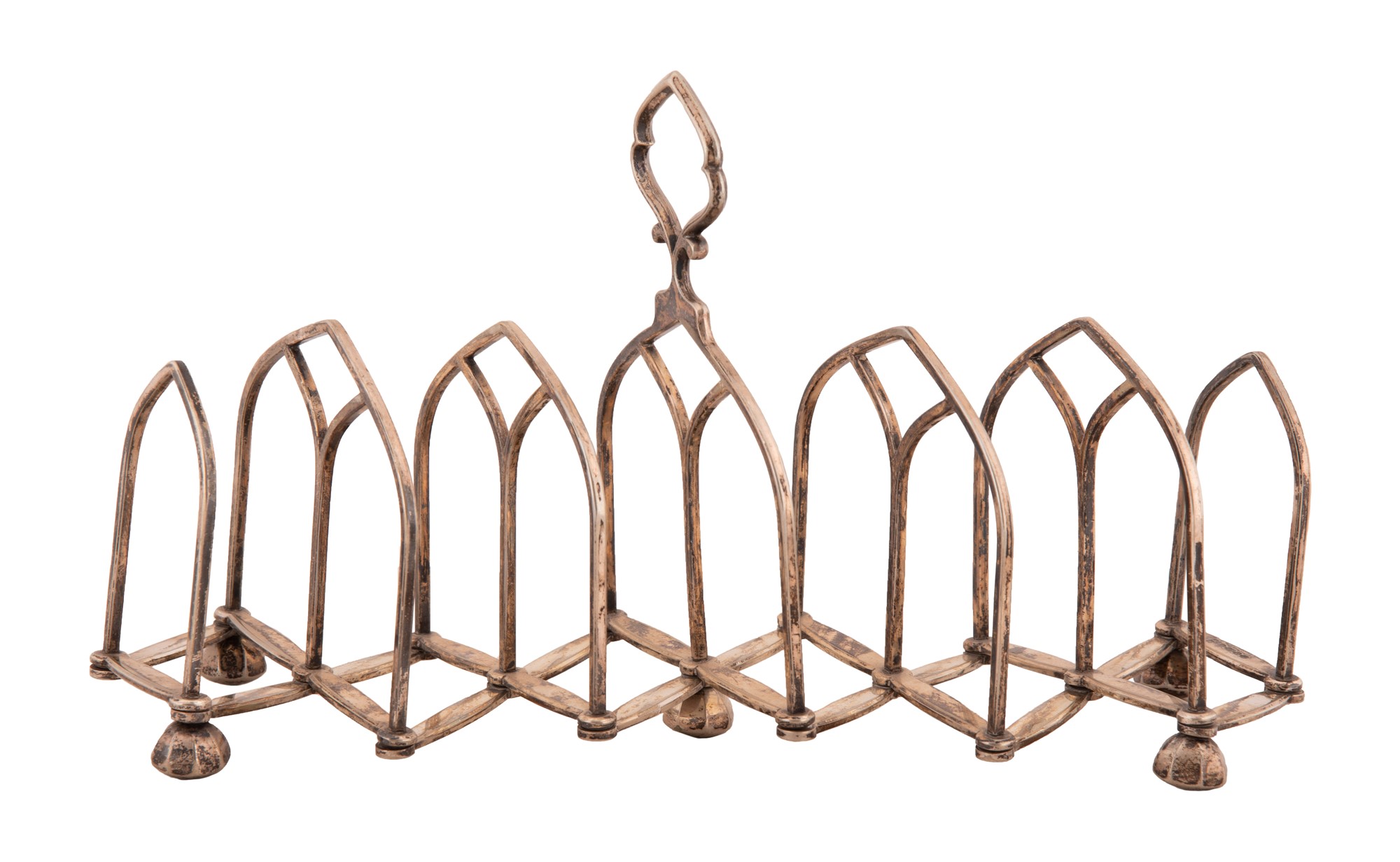 Portatoast da viaggio in metallo argentato con grazioso meccanismo e apertura a libretto XX secolo aperto: cm 15x50; chiuso: cm 15x6