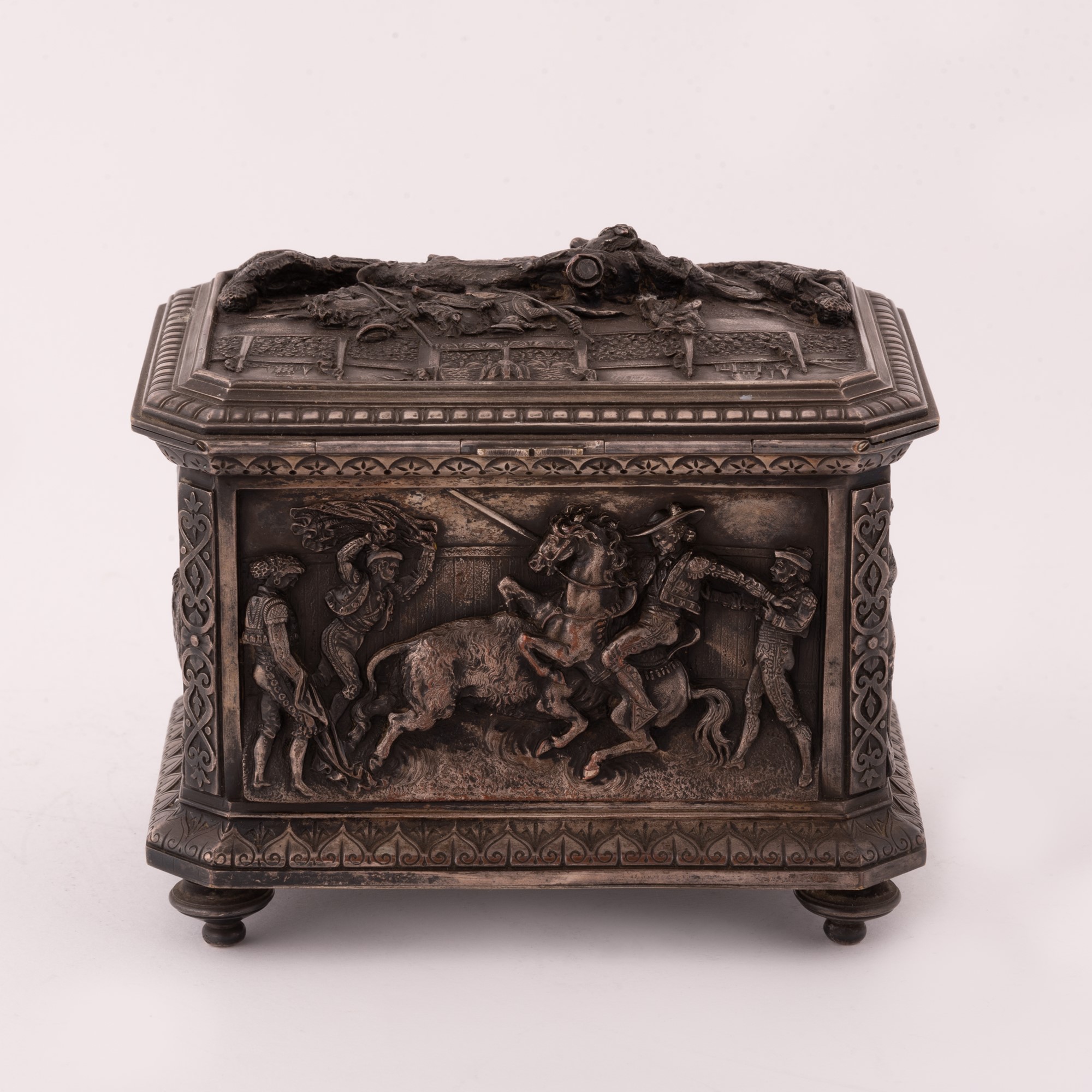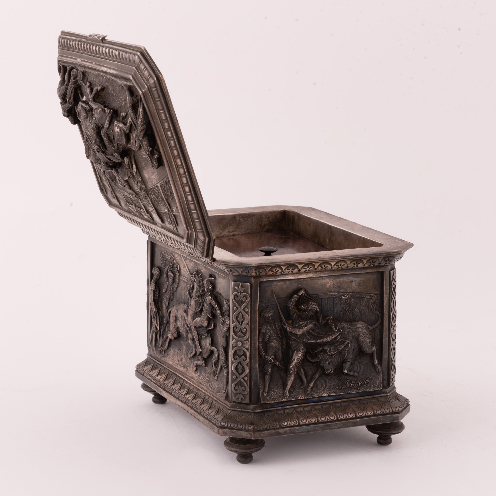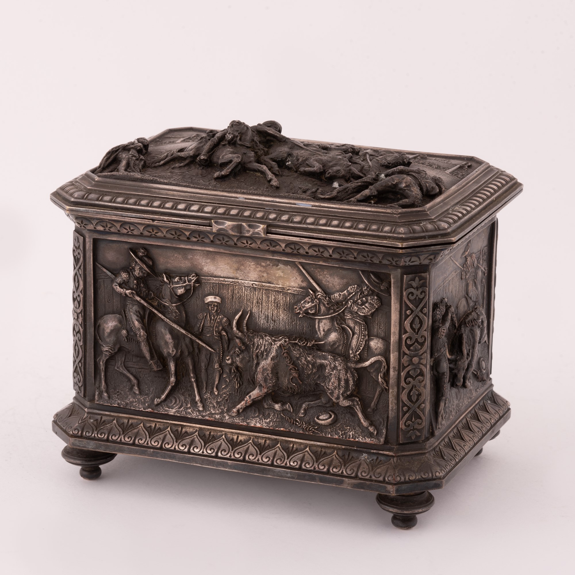 SCATOLA SPAGNOLA IN METALLO ARGENTATO DECORATA CON ALTORILIEVI RAFFIGURANTI SCENE DI CORRIDA XIX Serc.