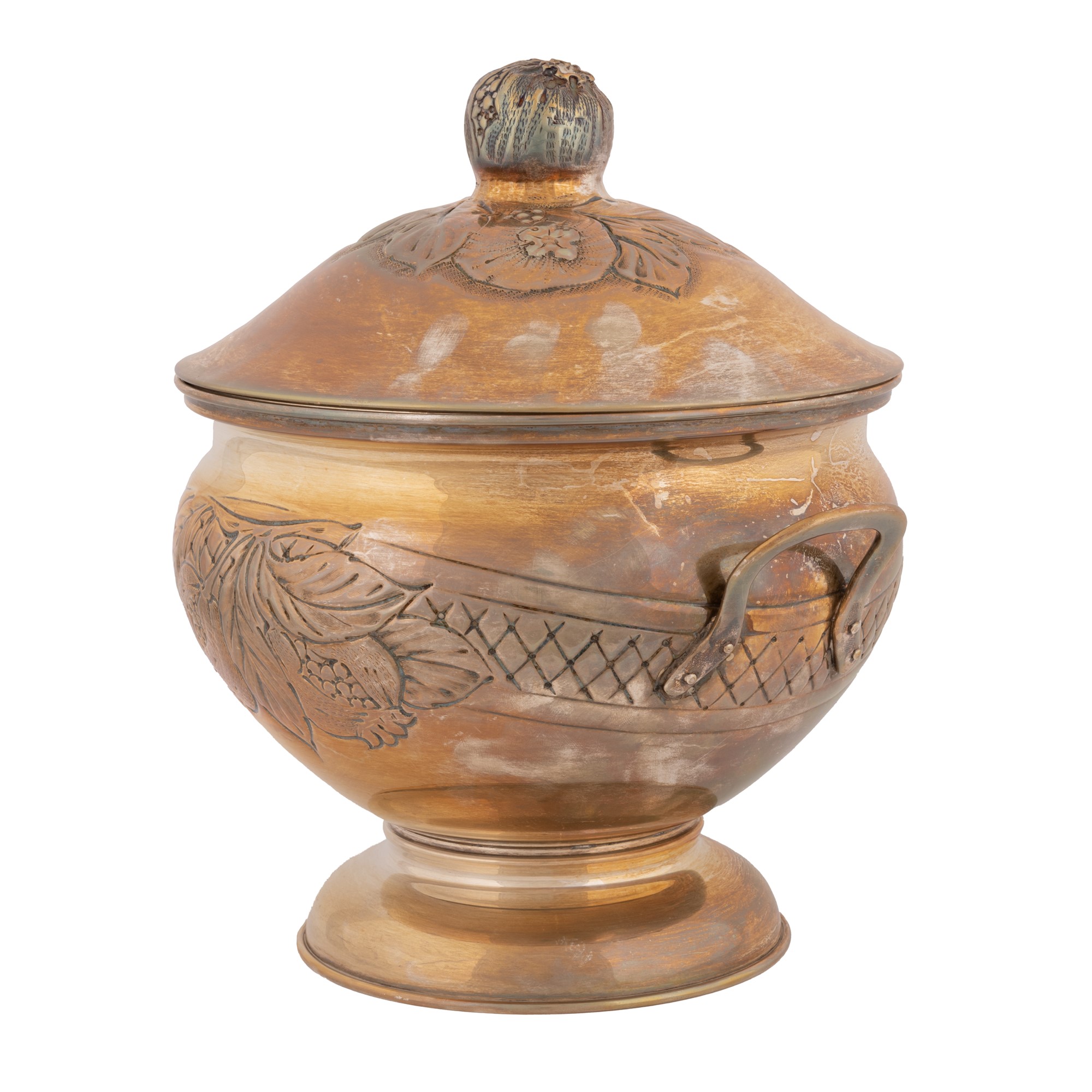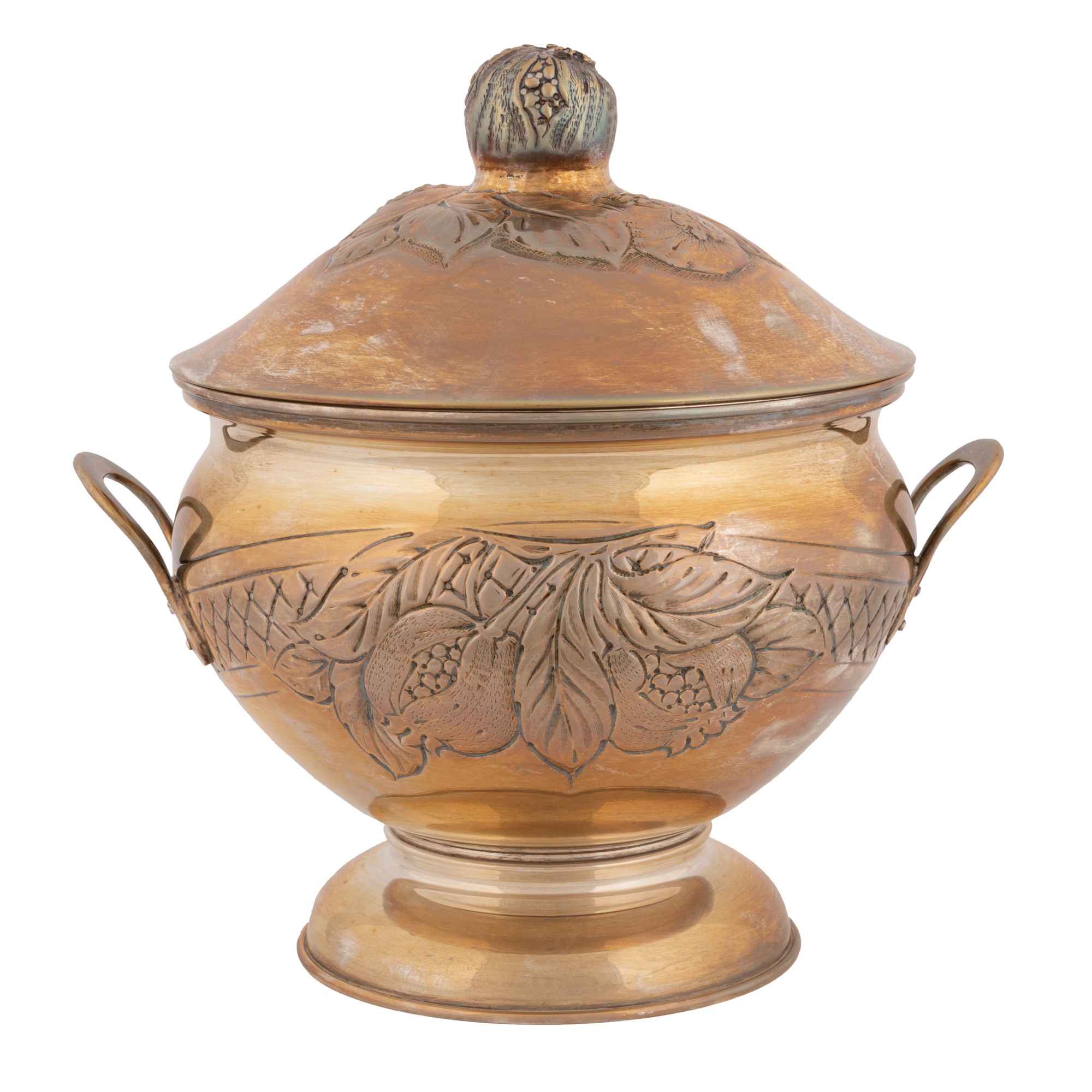 Zuppiera in argento finemente decorato a motivi geometrici e vegetali altezza con coperchio cm 27, Ø cm 30; peso g 1100 circa