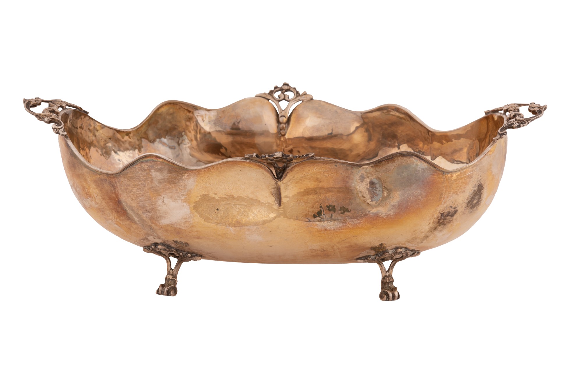Centrotavola in argento martellato di forma ovale poggiante su piedini ferini