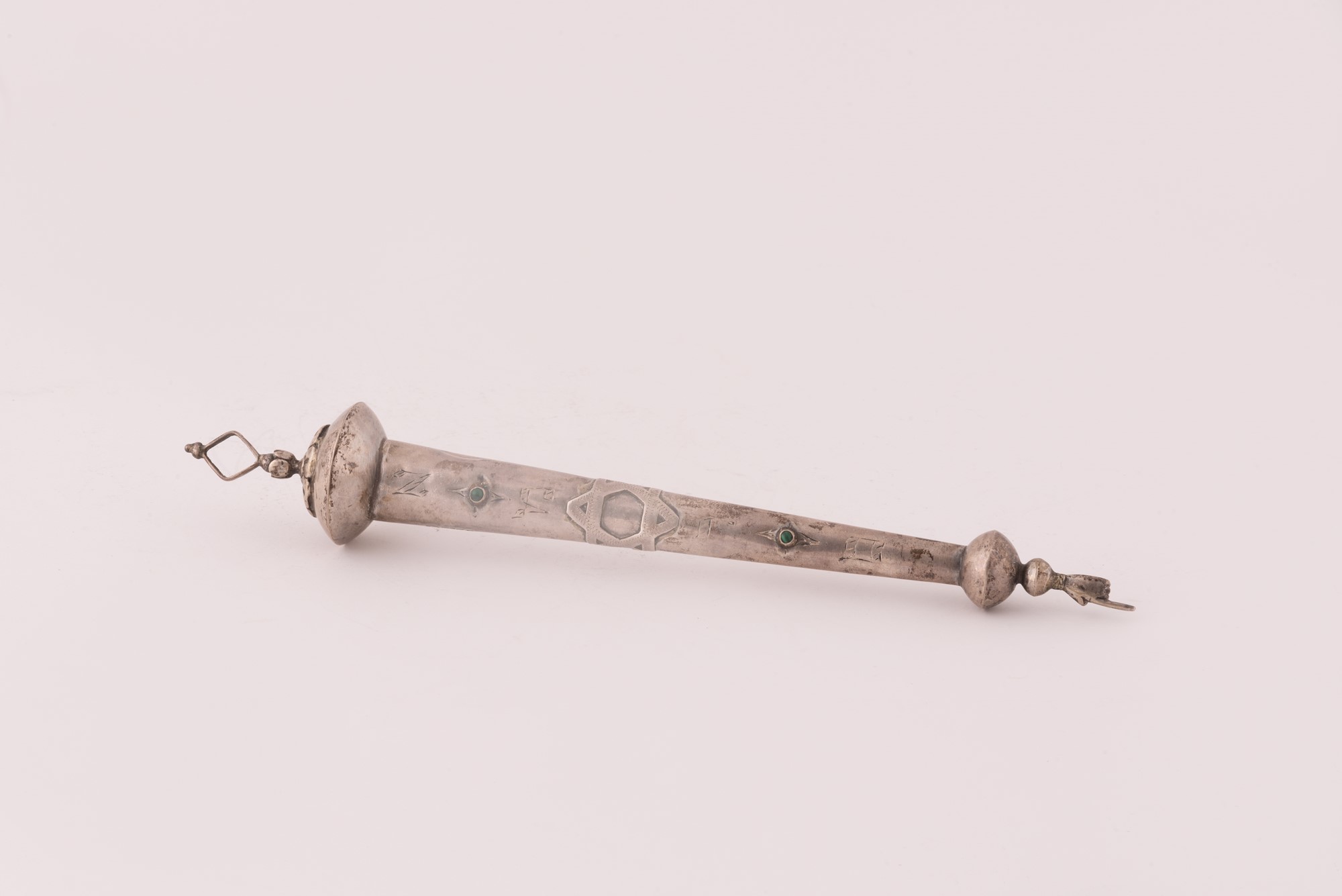 lunghezza cm 30; peso g 77 ca lunghezza cm 30; peso g 77 ca XIX Sec. Impugnatura liscia con inciso a rilievo il sigillo di Salomone ed incastonate due pietre dure verdi; tipico finale con indice della mano.