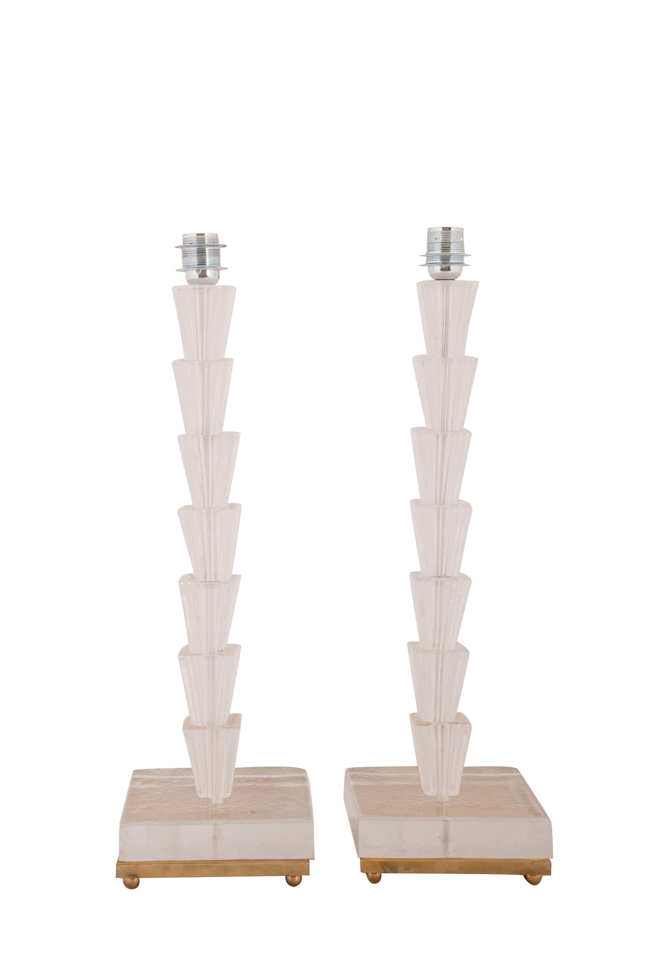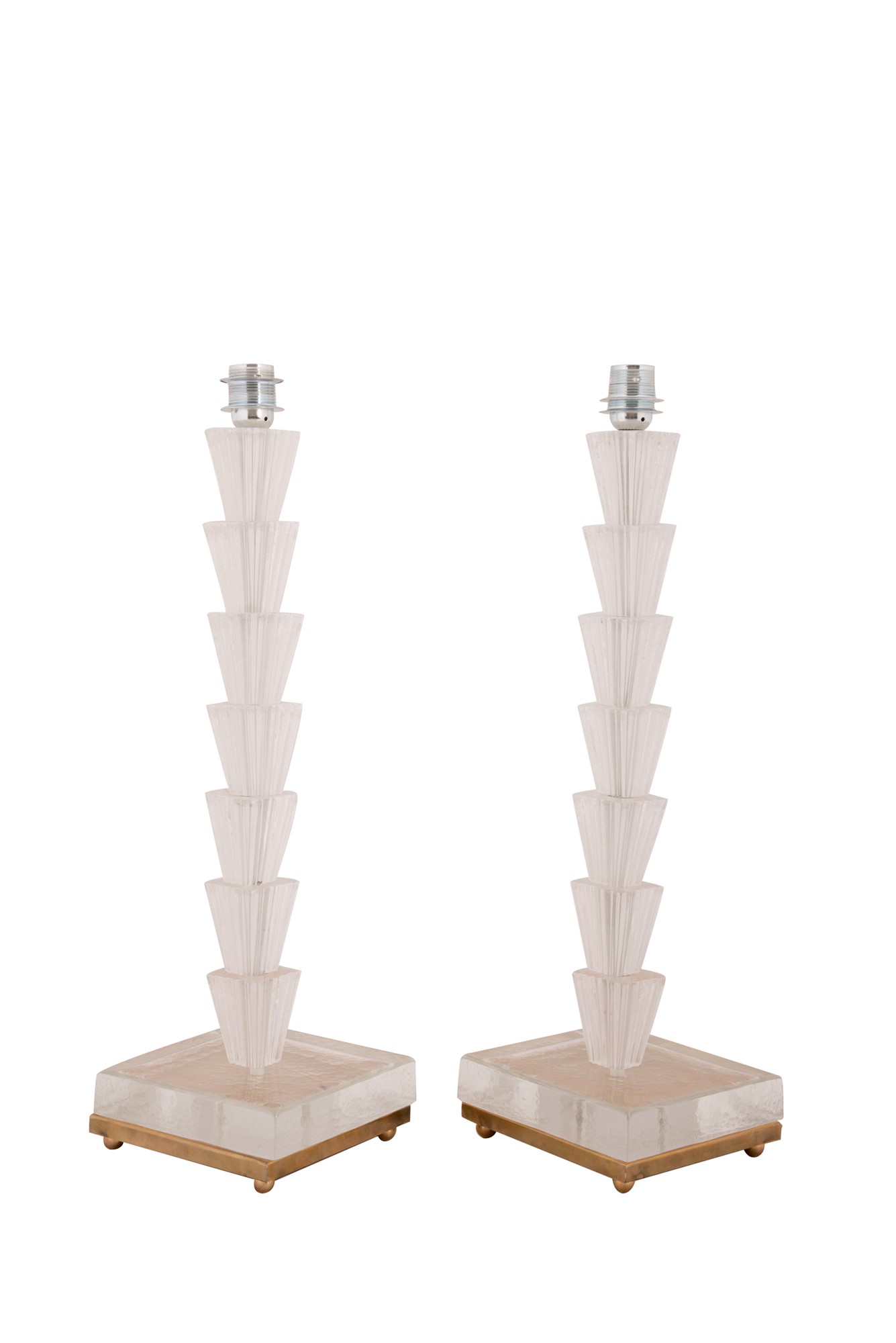 cm 70x20x20 cm 70x20x20 Coppia di lampade in vetro di forma piramidale con base quadrangolare in ottone sorretta da quattro piedini a sfera