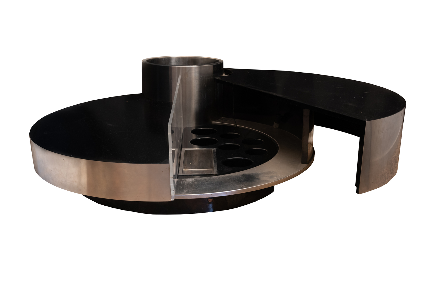 Massimo Papiri (XX secolo - ) Tavolo basso Harry's Bar in acciaio di Massimo Papiri per Mario Sabot Anni '70 Acciaio inox, alluminio e laminato cm 43,5×137x120,5 cm