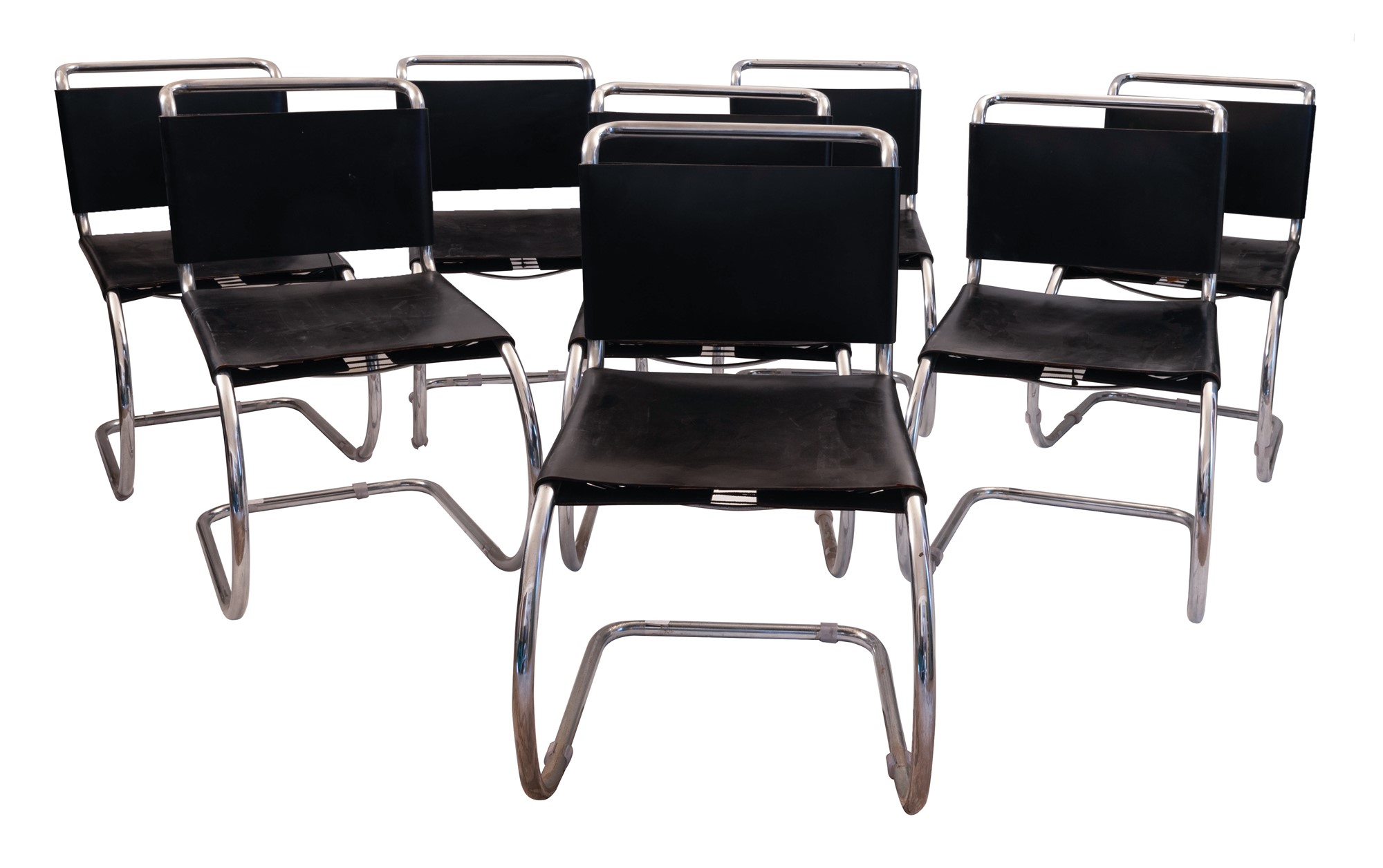 8 SEDIE ANNI ’80 RIPRODUZIONE STILE BAUHAUS DISEGNATA DA MART STAM E MARCER BEUER IN ACCIAIO E CUOIO NERO
