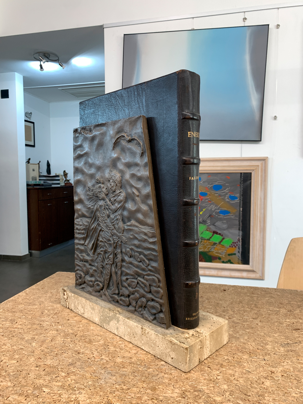 Il volume è accompagnato da due bassorilievi in bronzo fuso (raffiguranti Didone ed Enea e la fuga di Enea da Troia) poggianti su piedistallo di travertino romano, ciascuno recante firma incisa al fronte