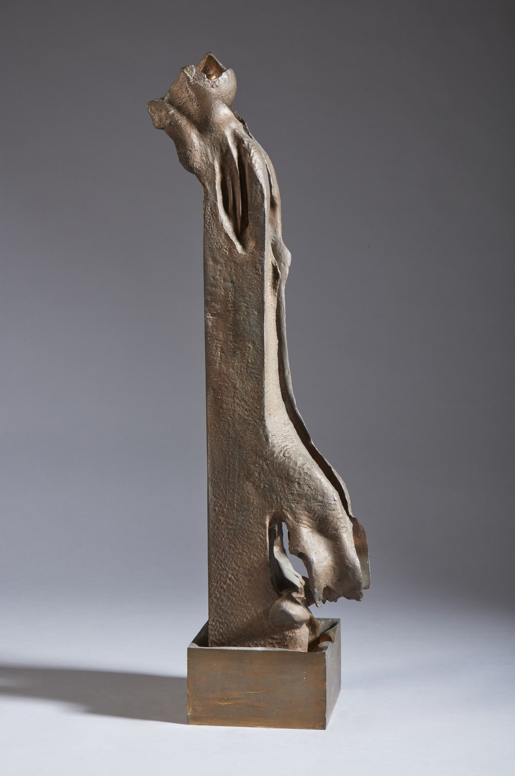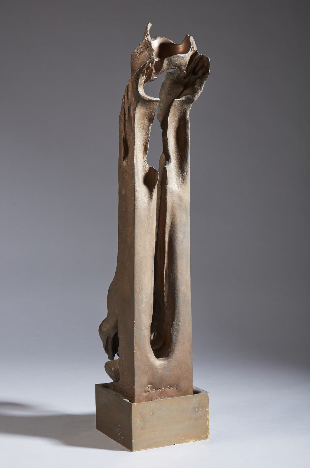 SOMAINI FRANCESCO (1926 - 2005) Ascolto dal profondo (II variante). Bronzo patinato. Cm 20,00 x 95,00 x 30,00. 1967-1968. Pezzo unico. Due elementi in bronzo patinato con lucidi parziali. Firma e anno sull'elemento verticale, marchio LG (eseguito in Lomazzo Como, Italia) in basso al centro. Opera archiviata presso la Fondazione Francesco Somaini, Milano, come da documentazione allegata all'opera. Pubblicazione: Catalogo ragionato della scultura di Francesco Somaini a cura di Enrico Crispolti e Luisa Somaini, Edizioni Skira, 2021, p.434. Lievi difetti.