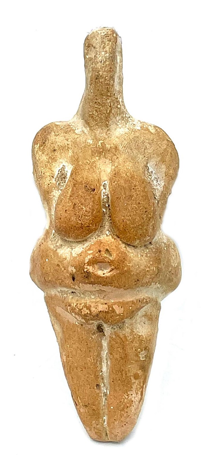Figura femminile stilizzata di dea madre, con testa ridotta ad un'appendice, enormi seni, braccia che li sostengono stilizzate solo come due incisioni; ampio ventre e natiche prominenti, pube triangolare e arti inferiori ridotti indicati solo da un'incisione