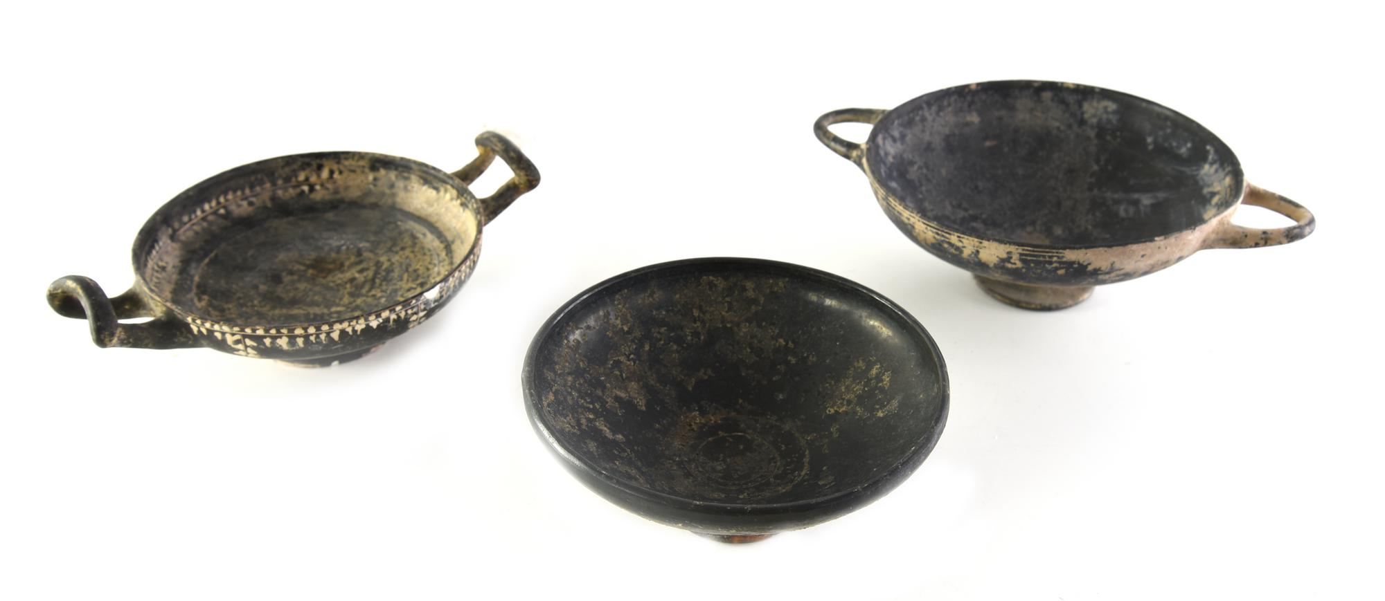 Kylix troncoconica in bucchero con labbro arrotondato, vasca poco profonda, piede troncoconico, anse a bastoncello impostate orizzontalmente sotto il labbro, decorata con fasce di linee incise parallele; coppa troncoconica a vernice nera con labbro rientrante e piede ad anello; kylix a vernice nera con orlo rientrante, vasca poco profonda, piede troncoconico, anse a bastoncello impostate sull'orlo e ripiegate verso l'alto, decorata in bianco con un tralcio di pampini sia all'interno che all'esterno della vasca (3)