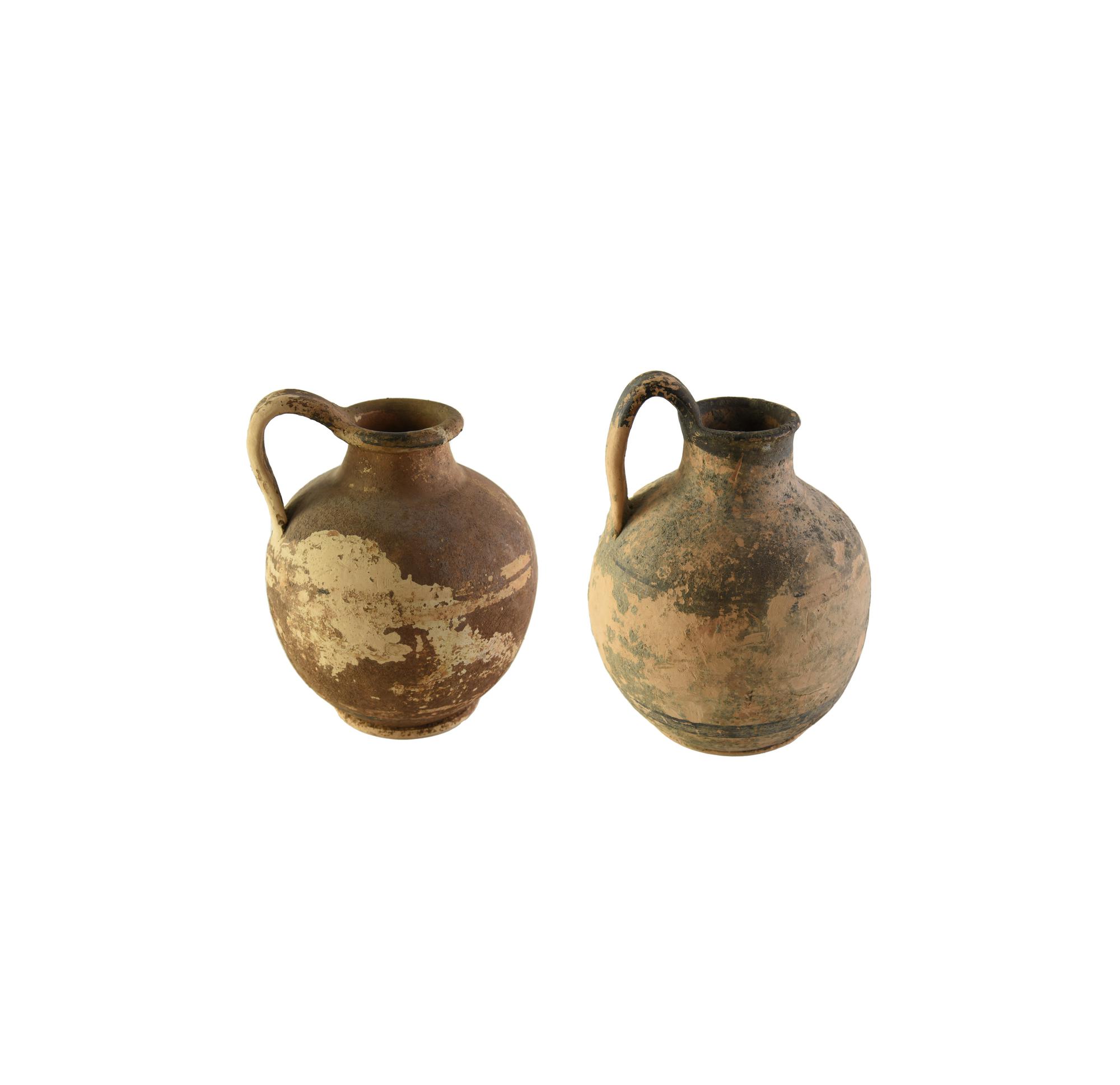 Due olpai con orlo ingrossato, collo cilindrico a profilo concavo, corpo globulare, piede ad anello, ansa a nastro impostata dal labbro alla spalla; decorate a fasce orizzontali parallele in bruno