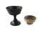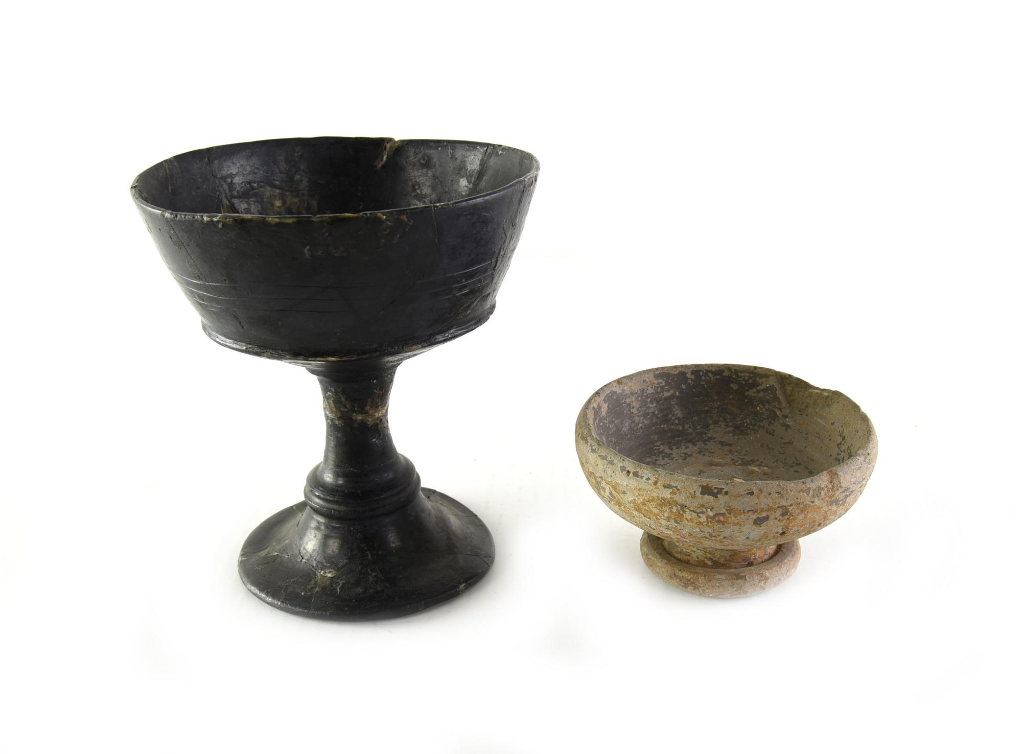 Calice su alto piede con vasca troncoconica e alto labbro impostato sulla vasca mediante risega, decorato con linee incise parallele ampio piede a tromba con anello plastico decorato con solcature parallele; coppetta con orlo ingrossato, vasca poco profonda e piede a tromba