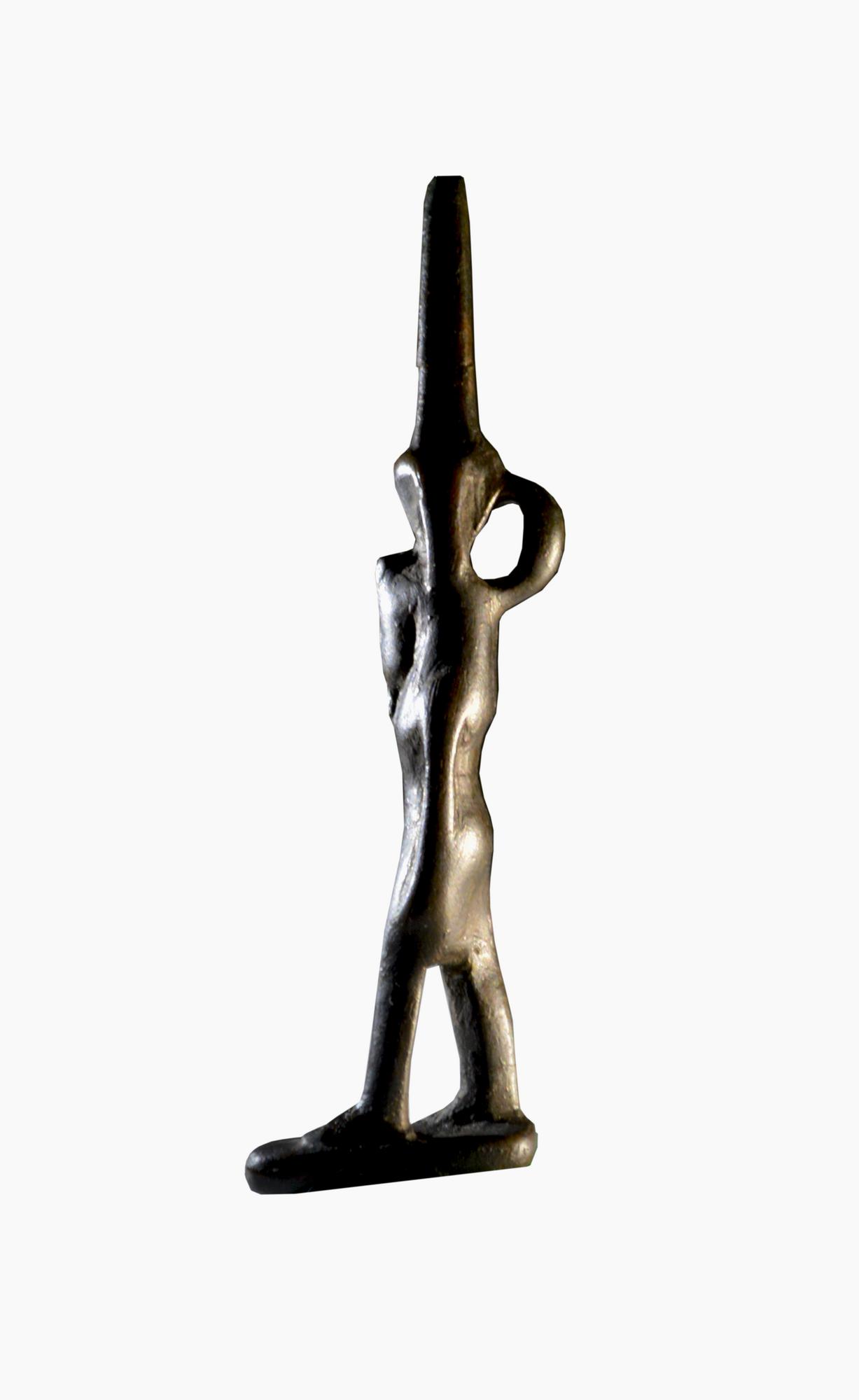 Amuleto in bronzo raffigurante il dio Nefertum, riconoscibile per la caratteristica corona col fior di loto e le piume, in posizione frontale col piede sinistro avanzato e l'altro arretrato; stante su base rettangolare e provvisto di anello per la sospensione sulla nuca.