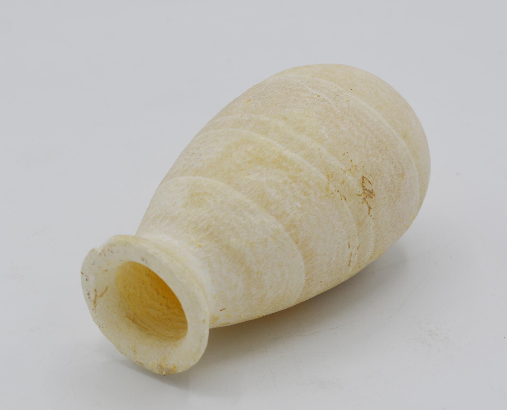 Alabastron in alabastro con labbro svasato, breve collo cilindrico, corpo ovoide allungato inferiormente, fondo piatto.