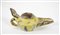 Lucerna con lungo becco, corpo biconico, fondo piatto, ansa ad anello; decorata ad invetriatura con smalti gialli e verdi