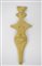 Figura femminile stilizzata stante in posizione frontale con le braccia aperte; il volto e' dominato dal grande naso a becco d'uccello, gli occhi, i seni e l'ombelico sono applicati; il pube e' evidenziato da file di puntini impressi.