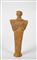 Figura femminile stilizzata stante in posizione frontale con le braccia ripiegate a sostenere il seno; il volto e' dominato dal grande naso a becco d'uccello, gli occhi ed i seni sono applicati; la lunga veste scende fino al suolo.