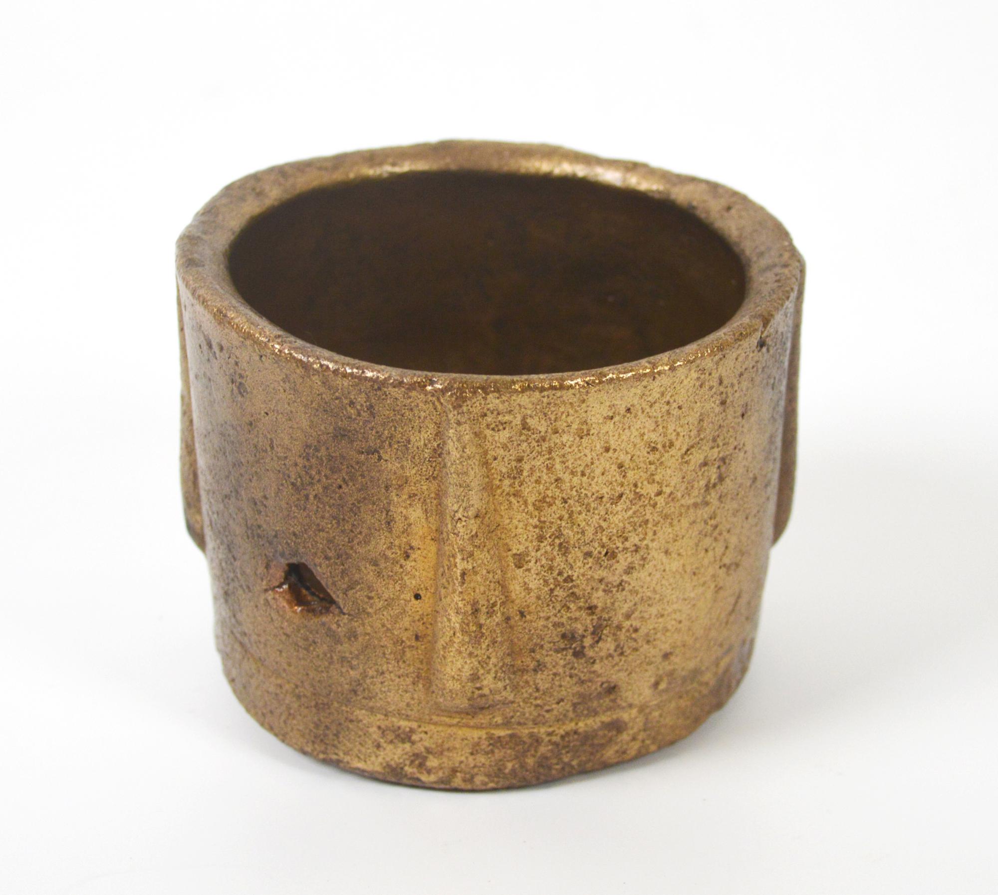 Mortaio in bronzo con orlo ingrossato, vasca cilindrica con quattro costolature in rilievo, fondo piatto.