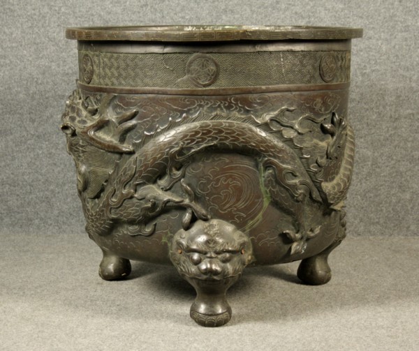 Antico cachepot cinese in bronzo cesellato con figure di draghi. Mis. Alt. cm. 47 Diam. cm. 50 ca.