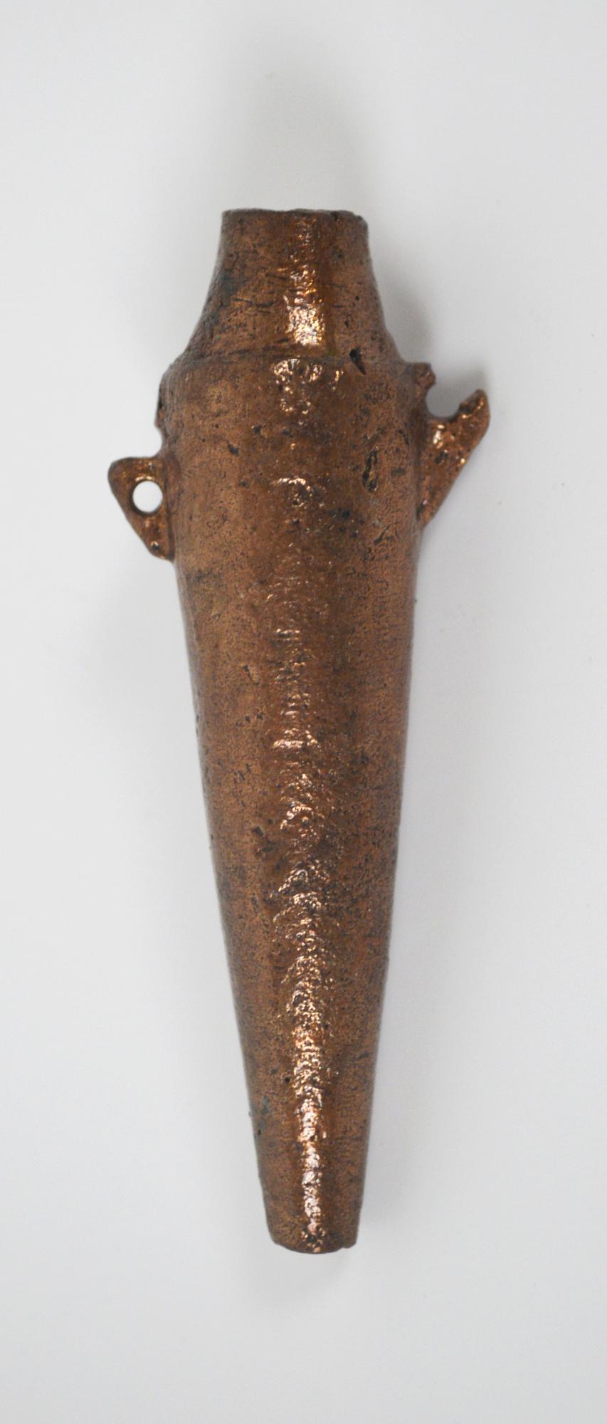 Alabastron con orlo obliquo e lungo corpo affusolato, fondo piatto, due piccole anse impostate verticalmente sul corpo.