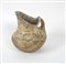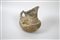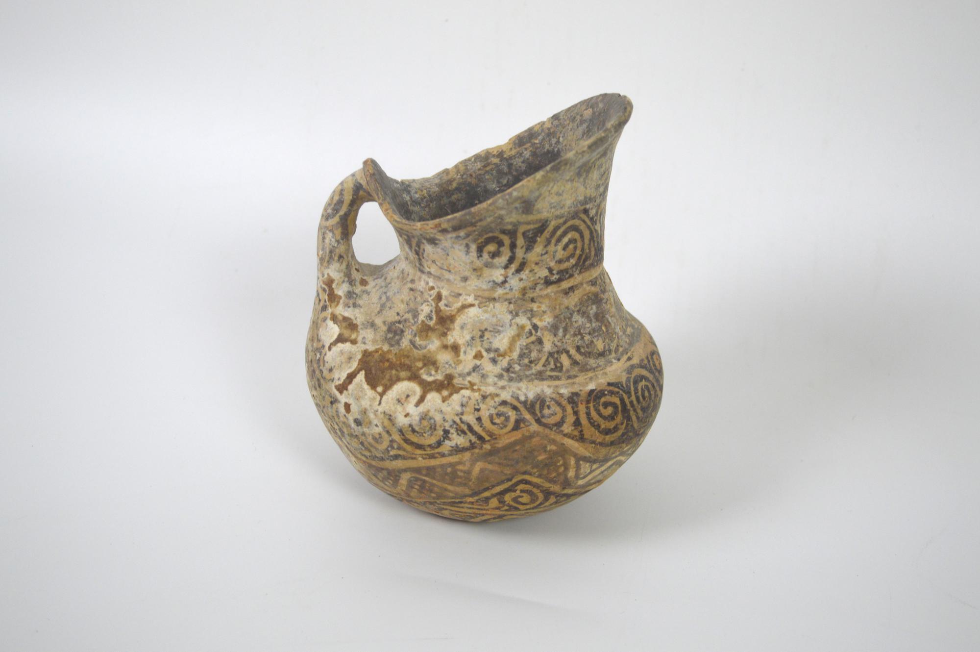 Brocca con becco obliquo, breve collo cilindrico, indistinto dal corpo globulare, fondo piatto, ansa a bastoncello impostata dal labbro alla spalla; decorata in bianco con eleganti girali e motivi fitomorfi.