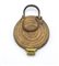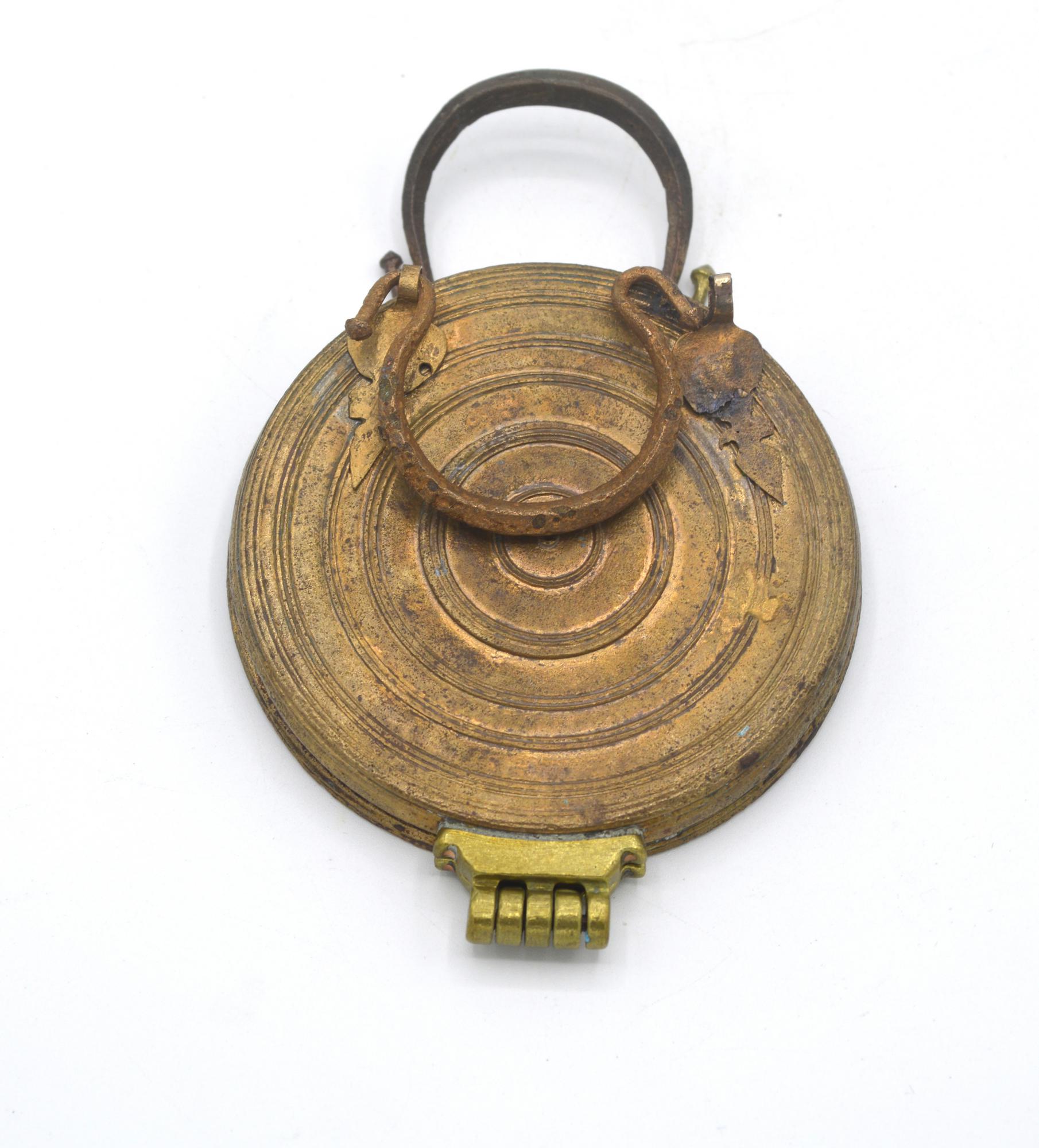 Specchio da viaggio di forma circolare, decorato a sottili linee incise concentriche sulla faccia esterna; ansa mobile con due protomi femminili all'attacco con lo specchio da un lato e cerniera che permette la chiusura dell'oggetto entro la sua custodia.
