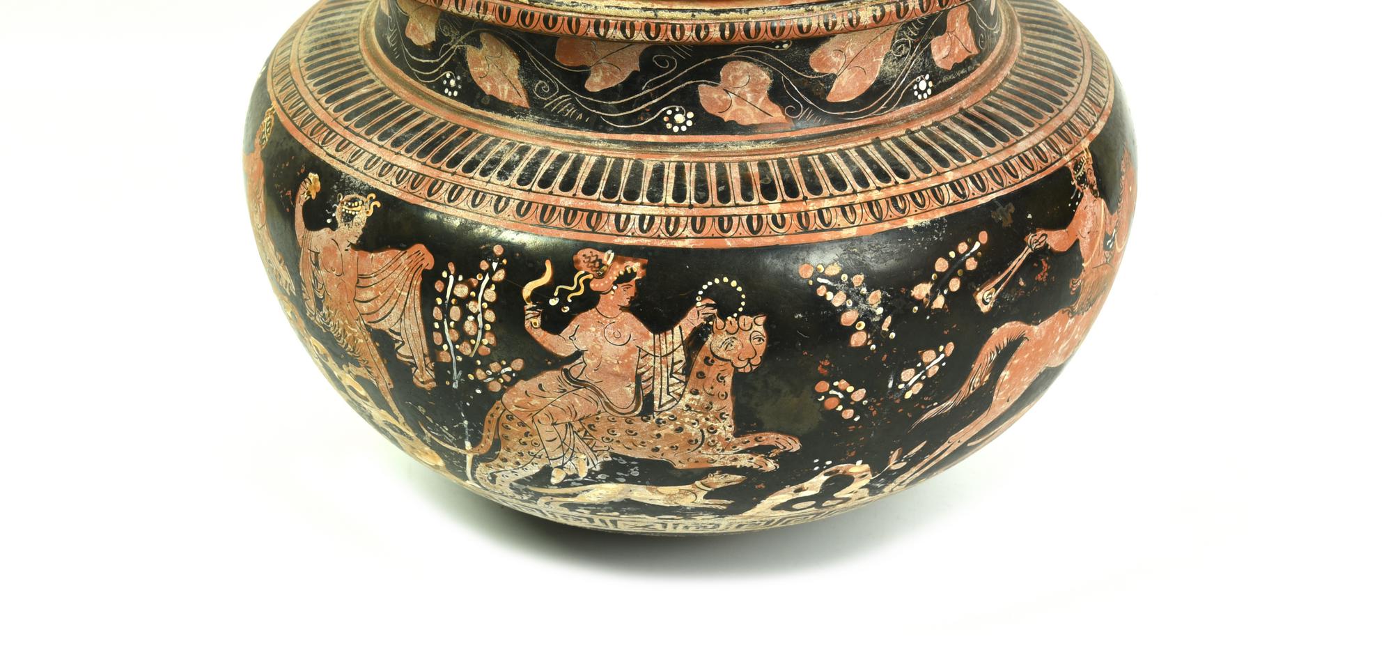 DECORAZIONE ACCESSORIA: orlo del dinos decorato da kyma ionico, collo con catena di foglie d'edera orizzontali e corimbi; spalla con falsa baccellatura e kyma ionico; parte inferiore della scena figurata con meandro sinistrorso.