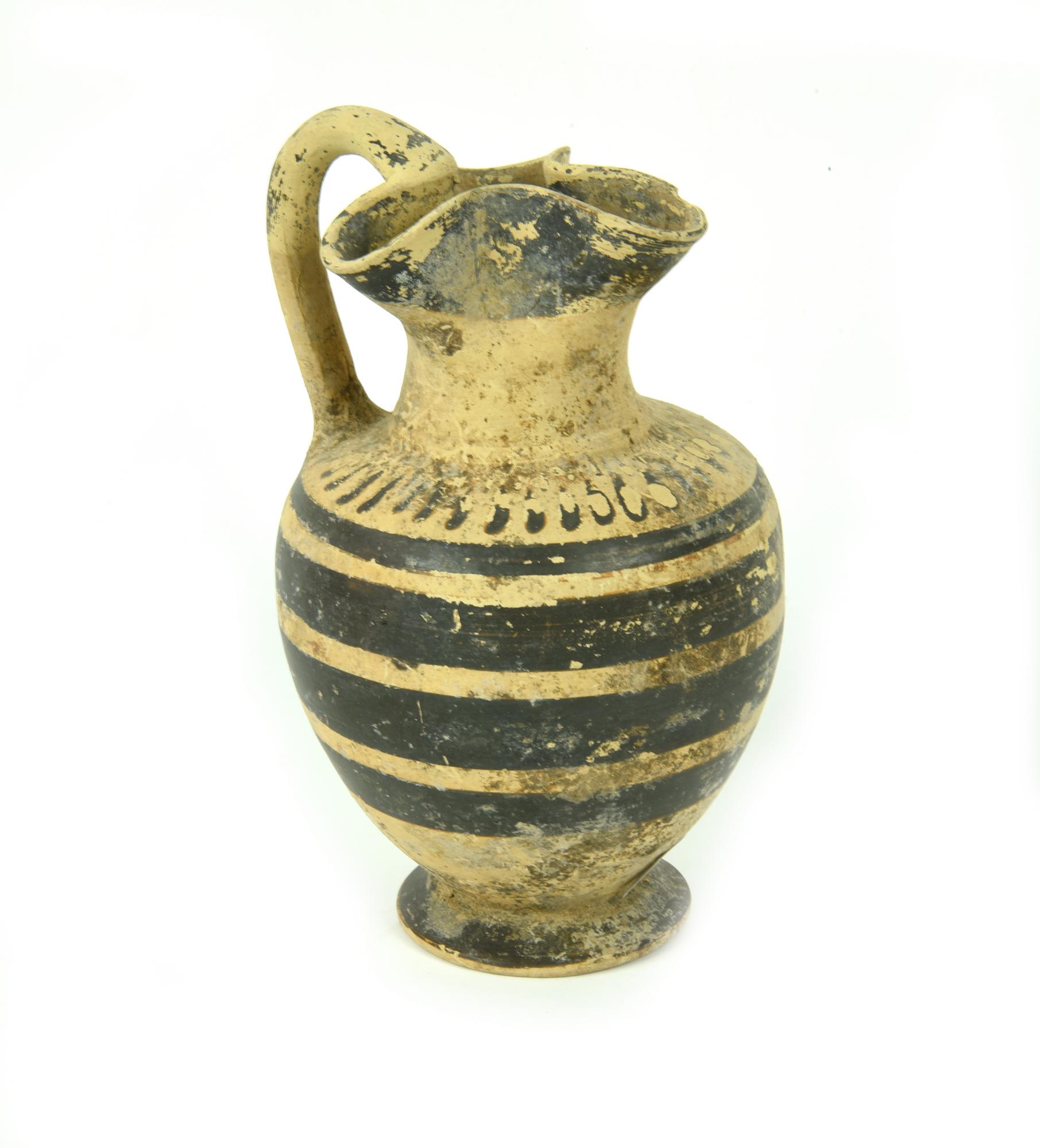 Oinochoe a bocca trilobata a vernice nera, pronunciata da due piccole apicature, collo troncoconico a profilo concavo distinto dalla spalla, corpo ovoide rastremato, piede ad echino, ansa a bastoncello, impostata dall'orlo alla spalla; decorata a fasce sul corpo e falsa baccellatura sulla spalla